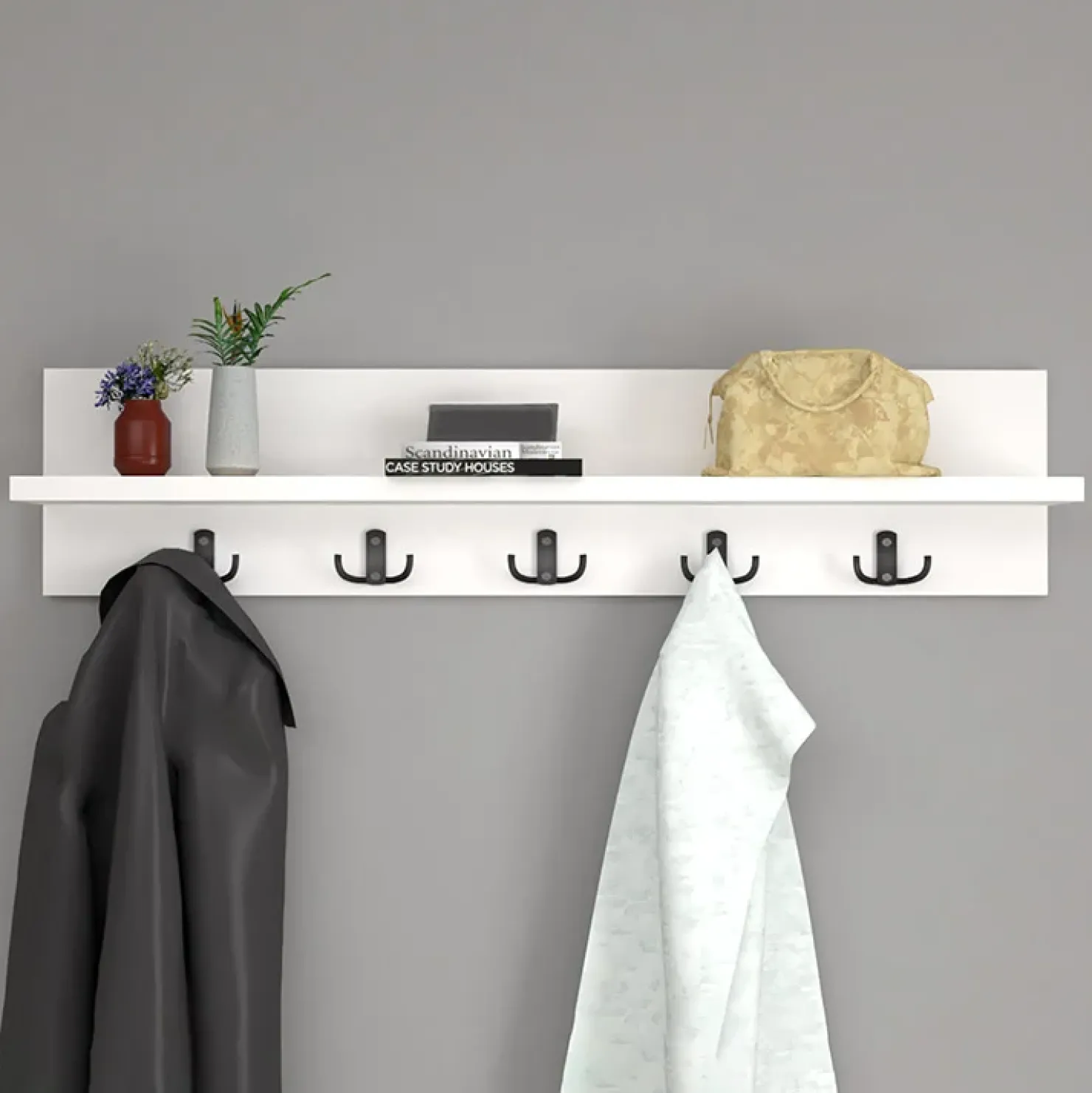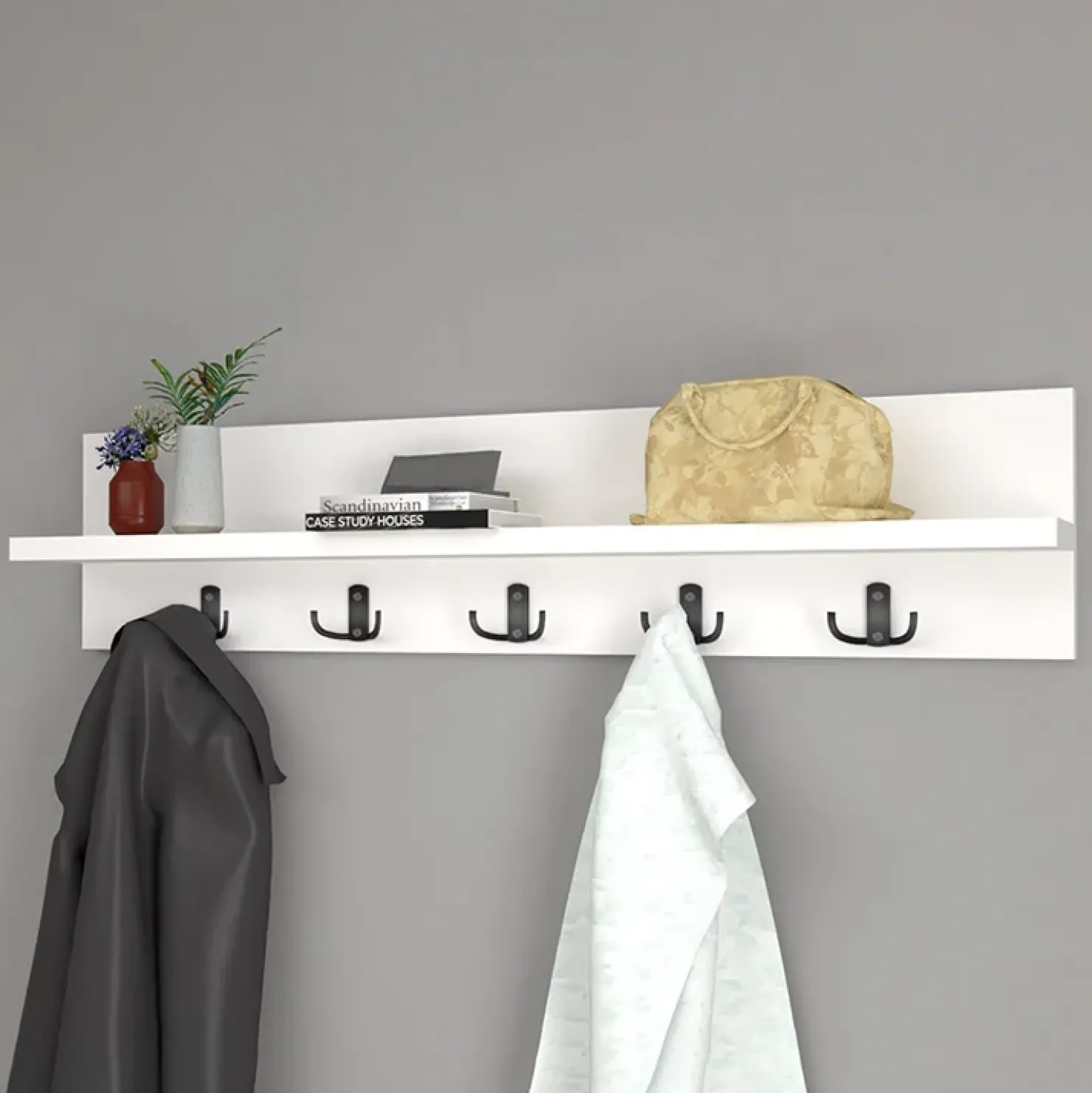 Realizzato in finitura bianca è formato da 5 ganci, per appendere giacche e ombrelli, e da una mensola superiore perfetta per depositare cappelli e borse.