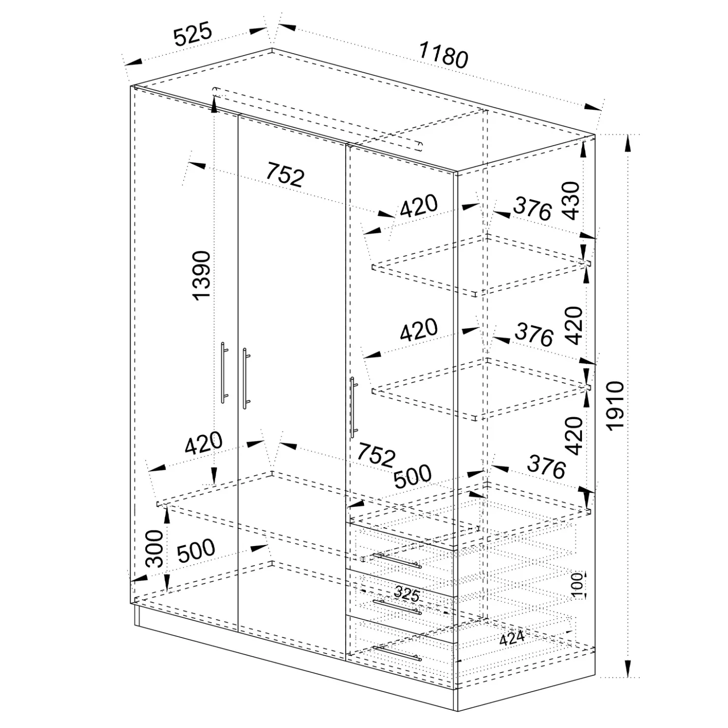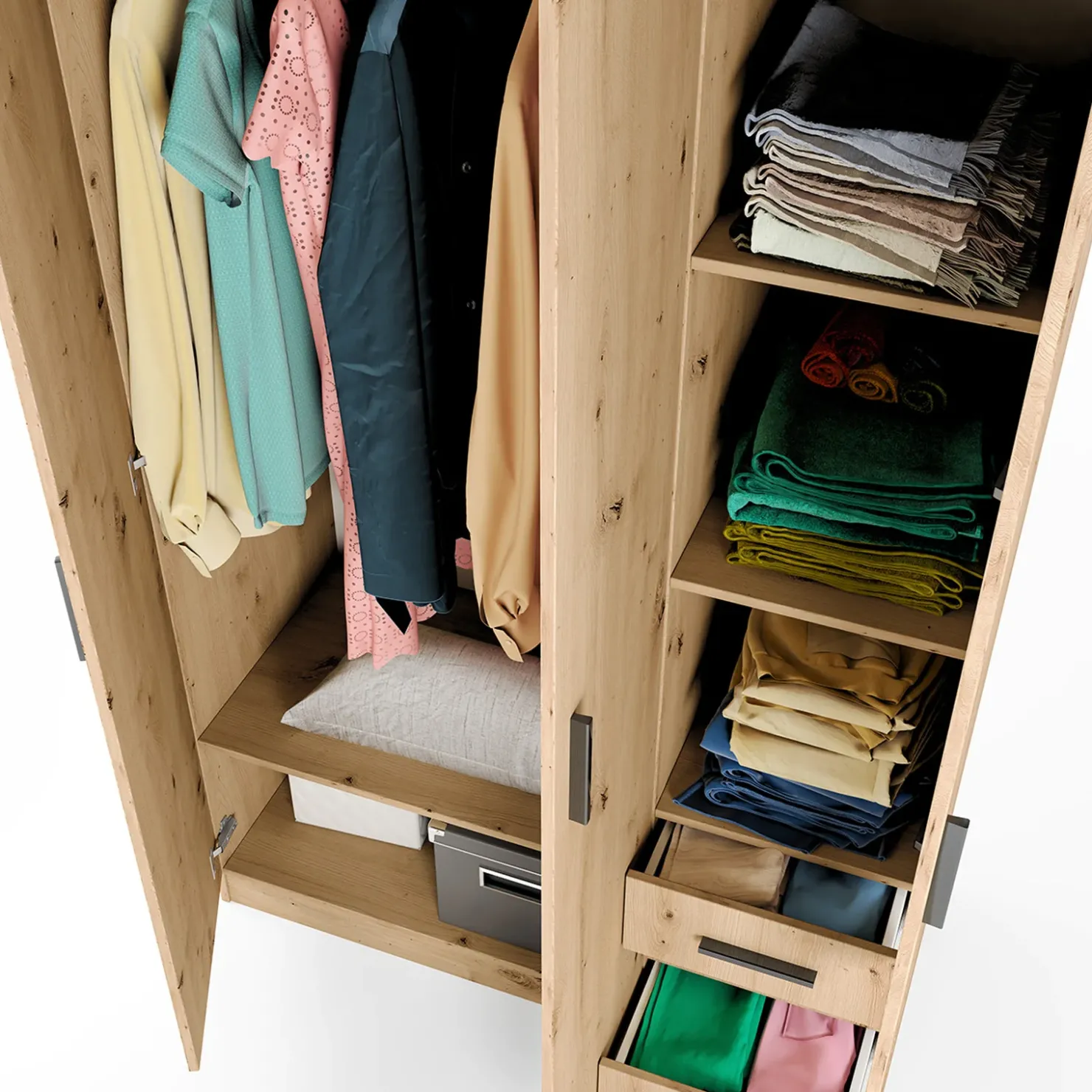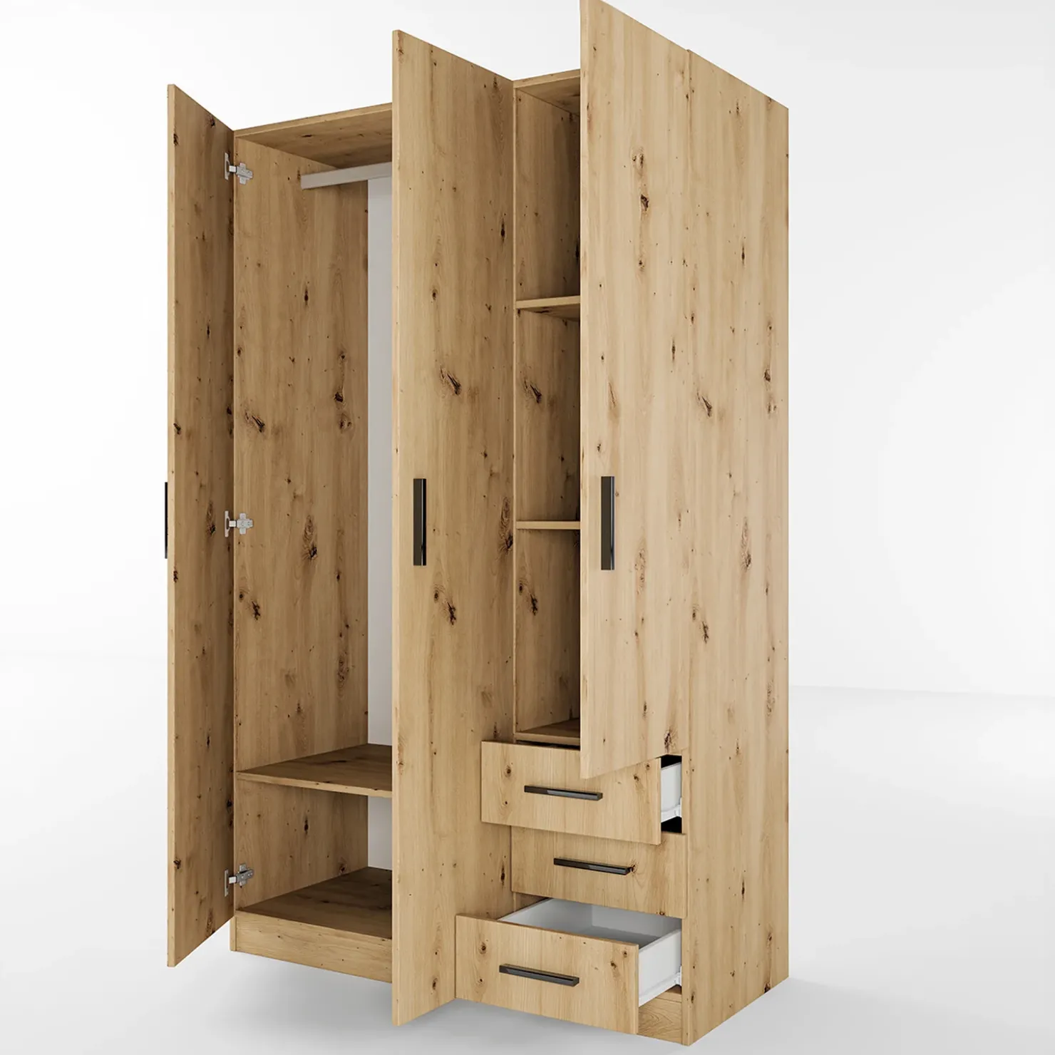 Presenta 3 ante battenti totali. Due si aprono su un vano che accoglie un asta appendiabiti ed un ripiano nella parte bassa. La terza anta invece racchiude un totale di 3 vani per riporre gli indumenti piegati. Sotto quest’ultima troviamo 3 cassetti sempre utili per riporre la biancheria.