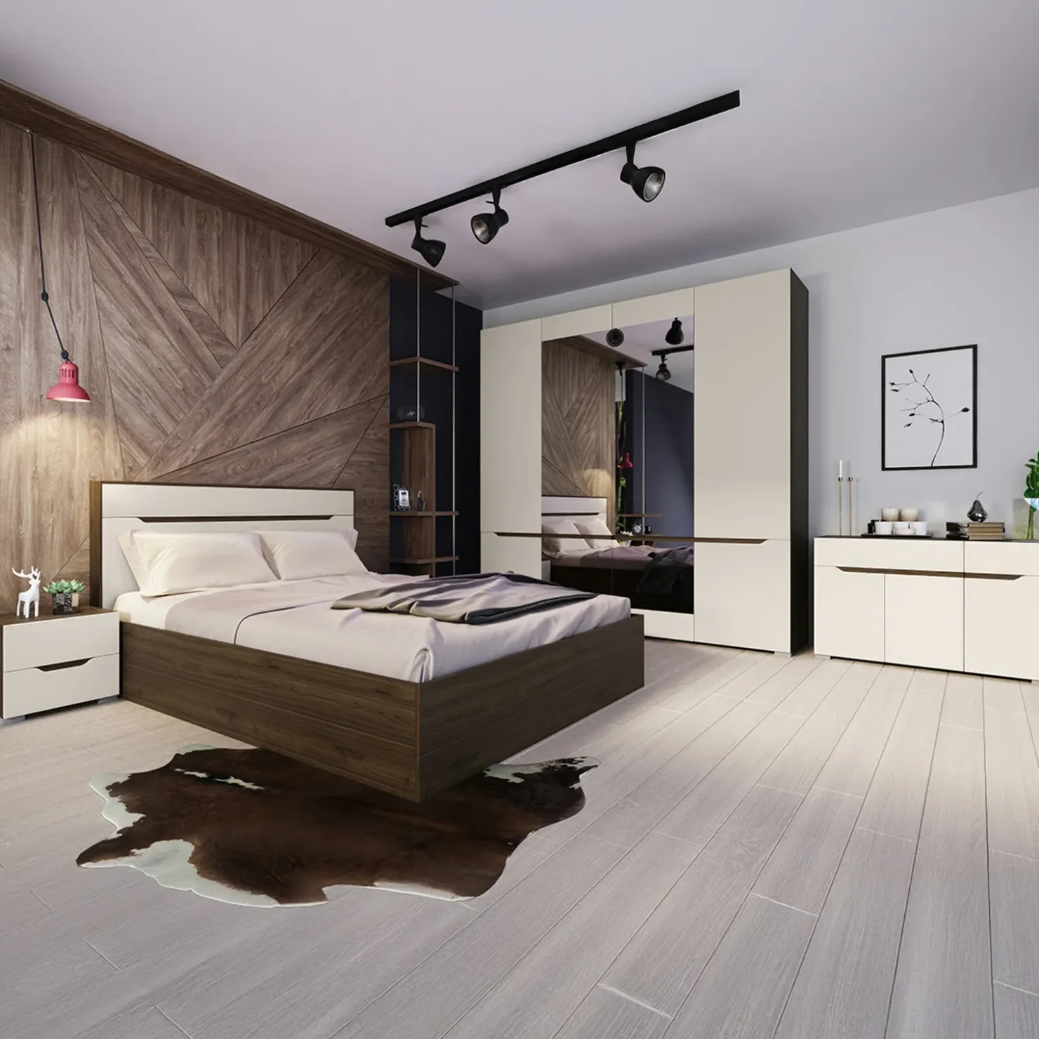 Brasilia è una camera da letto completa, in grado di rendere l’ambiente accogliente, grazie alla sua raffinata finitura noce champagne. Ampia e capiente, è dotata di: un letto contenitore matrimoniale, due comodini con due cassetti, un armadio con quattro ante battenti ed un comò con due cassetti e tre ante. I vari elementi di cui è composta permettono di ottimizzare e organizzare al meglio ogni spazio della zona notte.