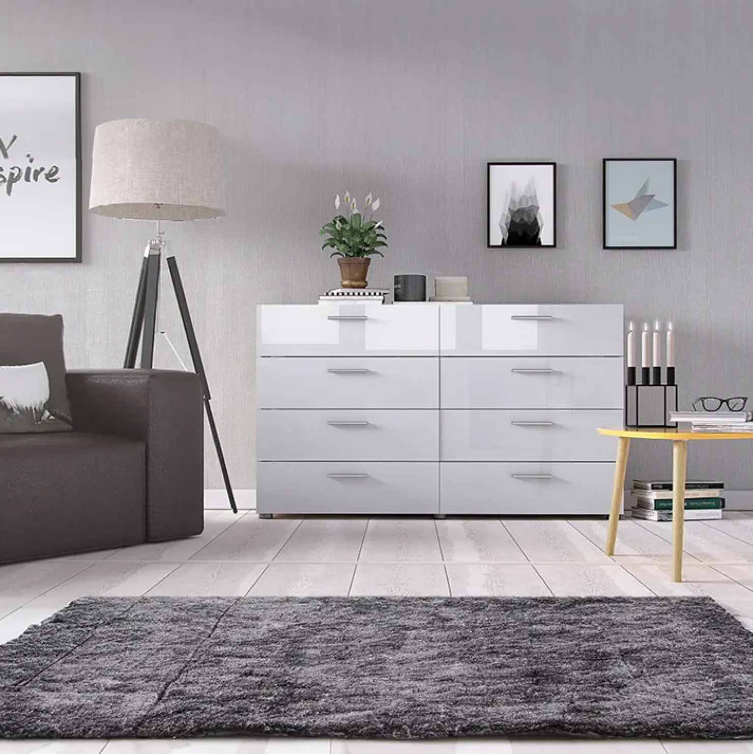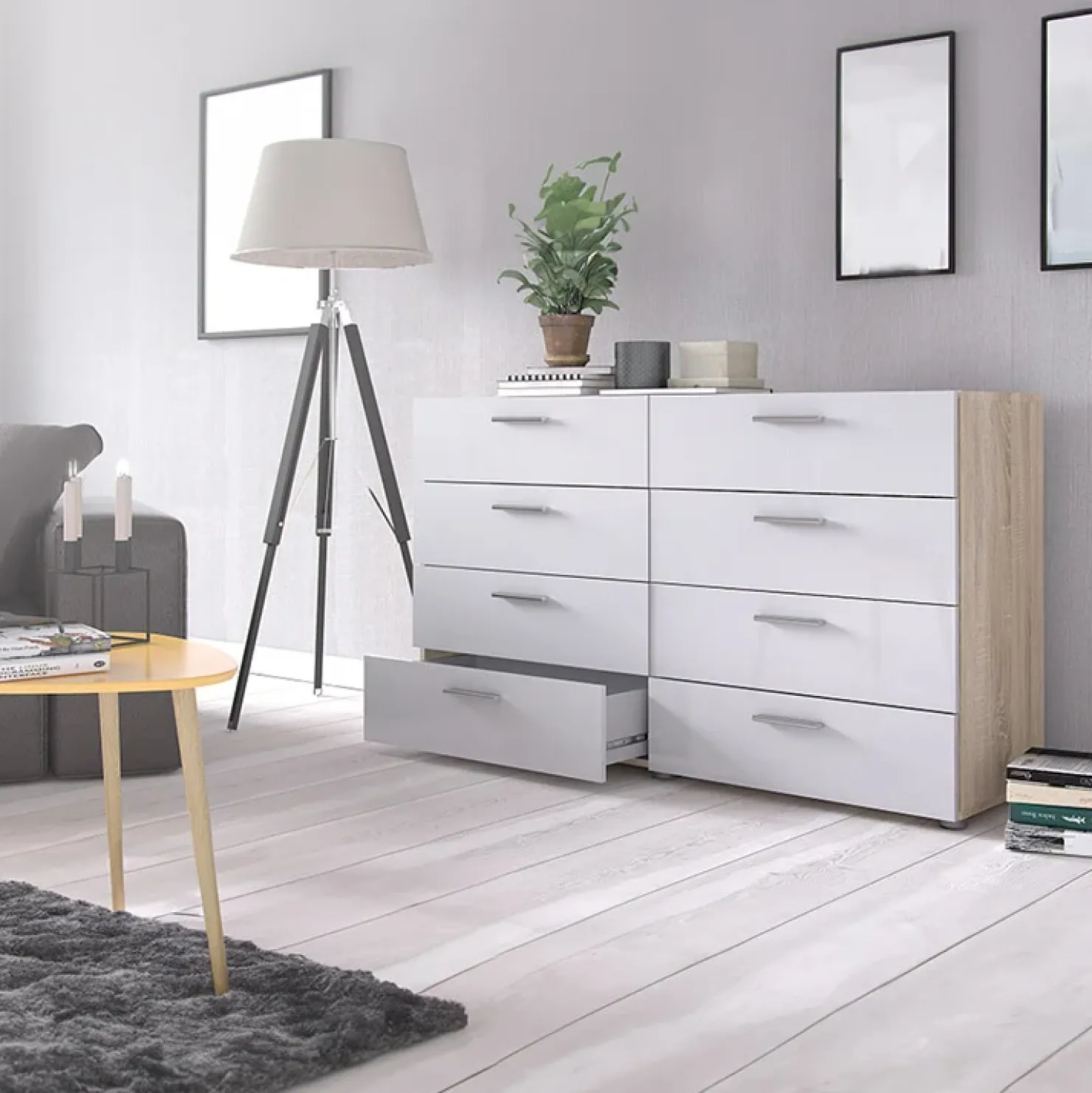 La cassettiera Betty Gihome ® in finitura bianco lucido e rovere si abbina bene a pavimentazioni in legno o finto legno dalle tonalità chiare, specie se si pensa ad una sua collocazione in camera da letto.