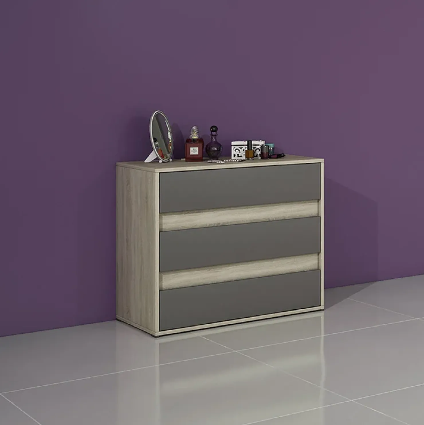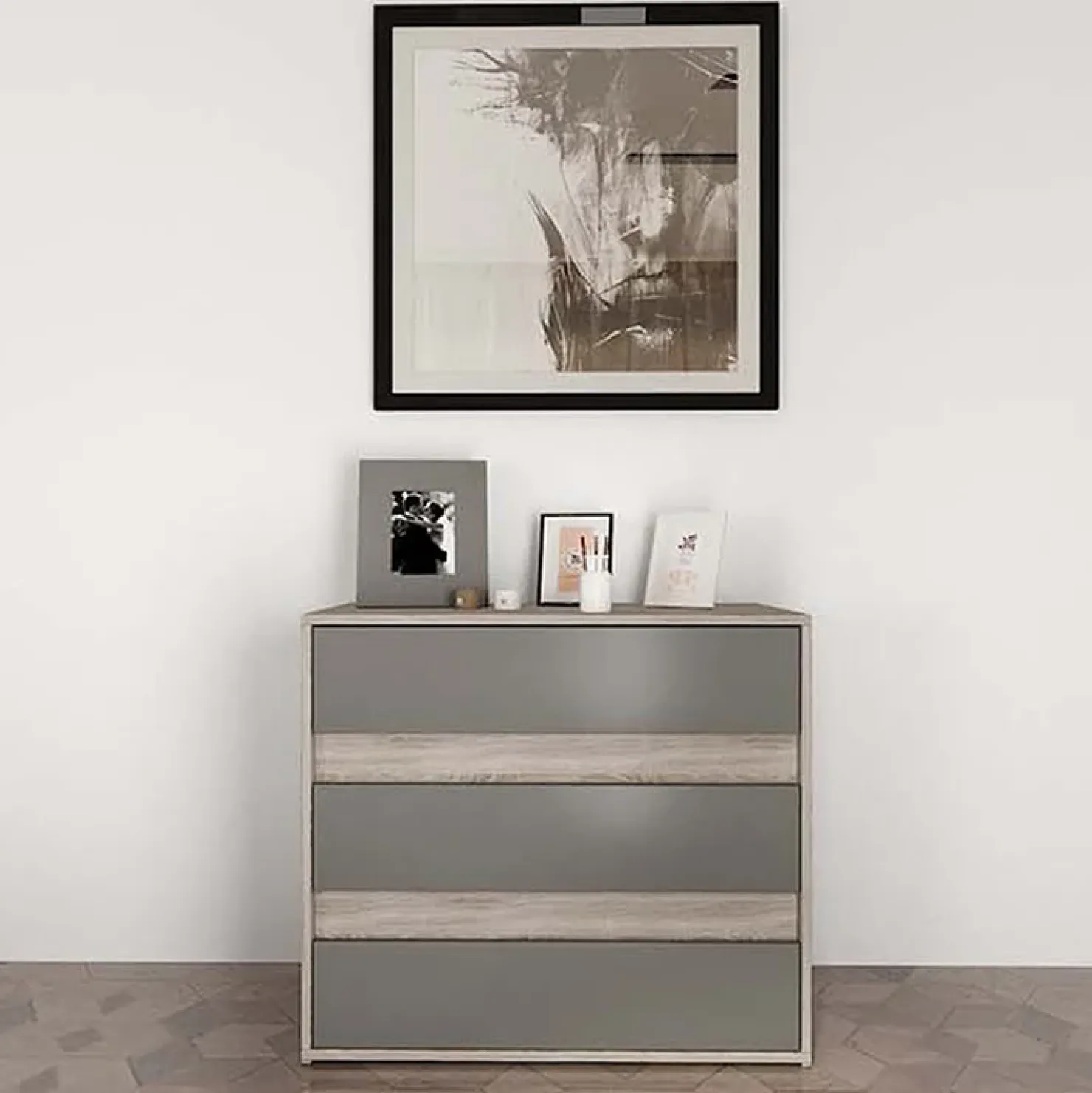 L’abbinamento di colori come il rovere ed il grigio, rendono questo comò perfetto per essere collocato in diverse tipologie d’arredamento.
