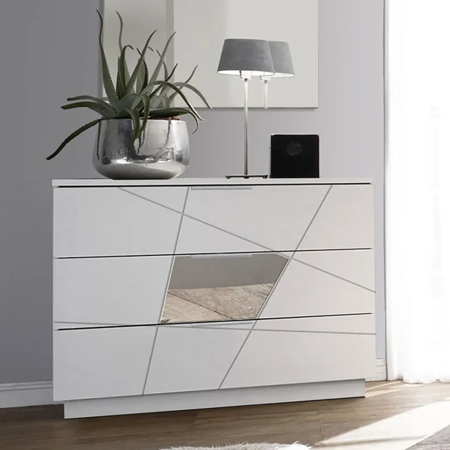 Proposto nella strepitosa finitura bianco opaco frassinato con serigrafia e specchio, è dotato tre ampi cassetti.