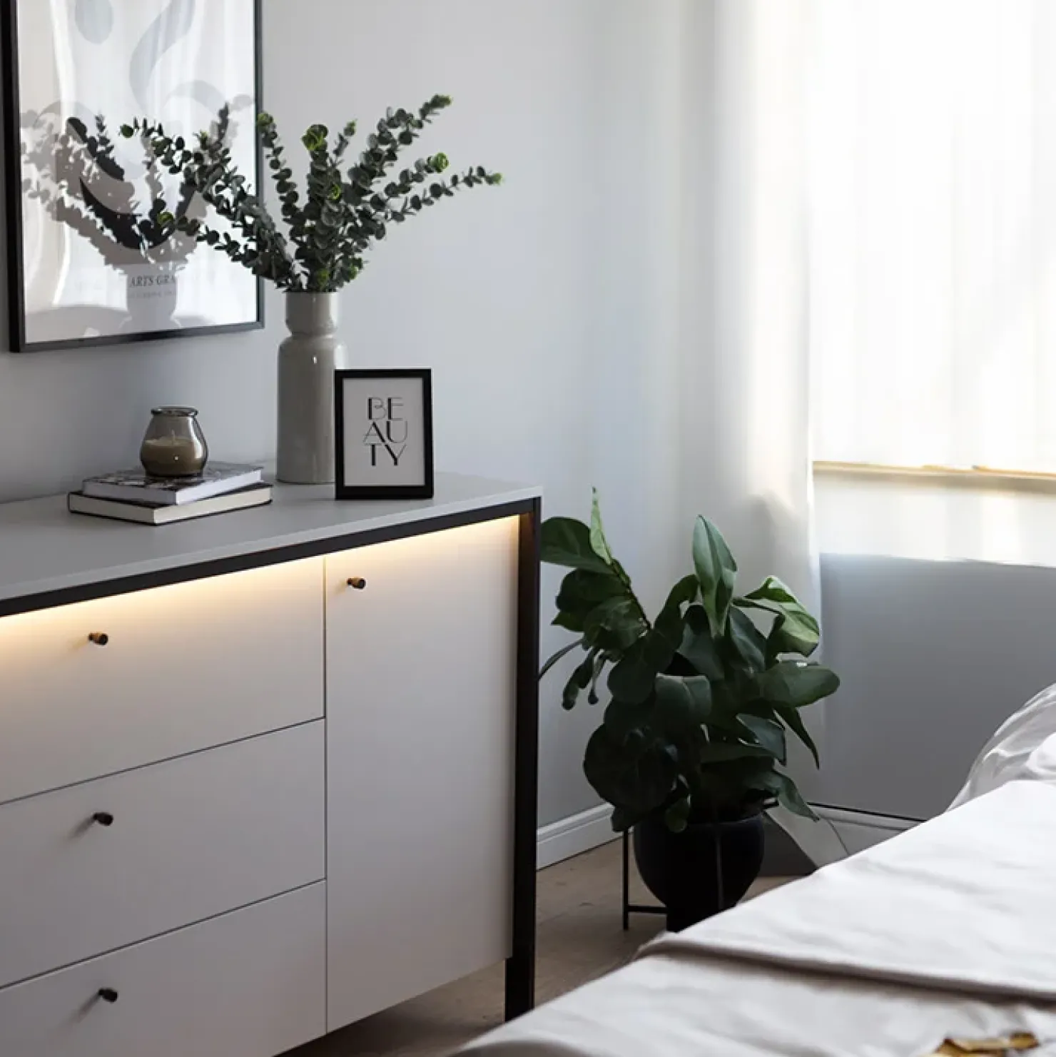 Oltre alla sua praticità, il comò si distingue anche per il suo aspetto decorativo. La sua illuminazione a LED, integrata nella struttura, conferisce un’atmosfera calda e sofisticata. I colori tenui e l’illuminazione creano un effetto visivo piacevole, arricchendo l’ambiente e aggiungendo un tocco di eleganza alla tua camera da letto.