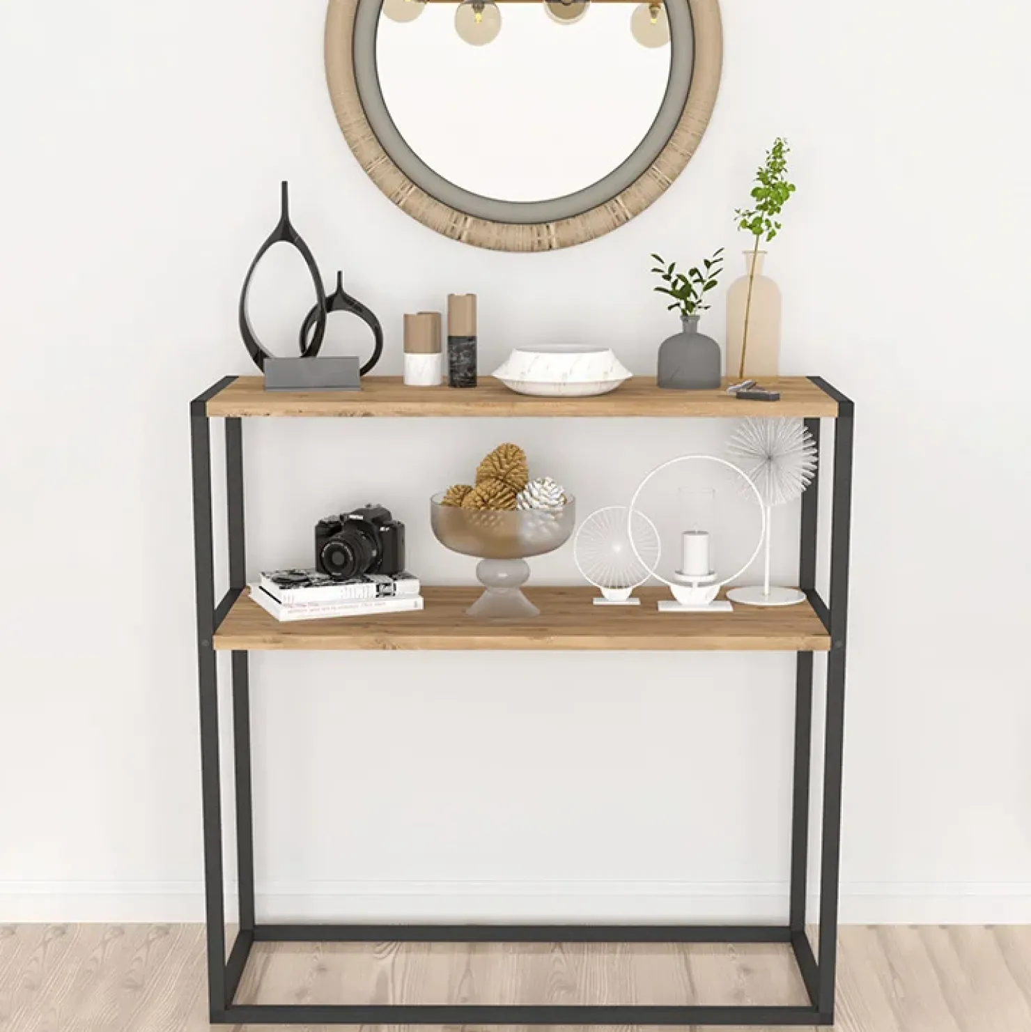 Con la Consolle ingresso Basilan fai spiccare lo stile industrial nella tua zona ingresso. Realizzato con una struttura in metallo nero verniciato, è dotato di 2 comodi ripiani in rovere in grado di ospitare accessori per la casa quali suppellettili e molto altro!