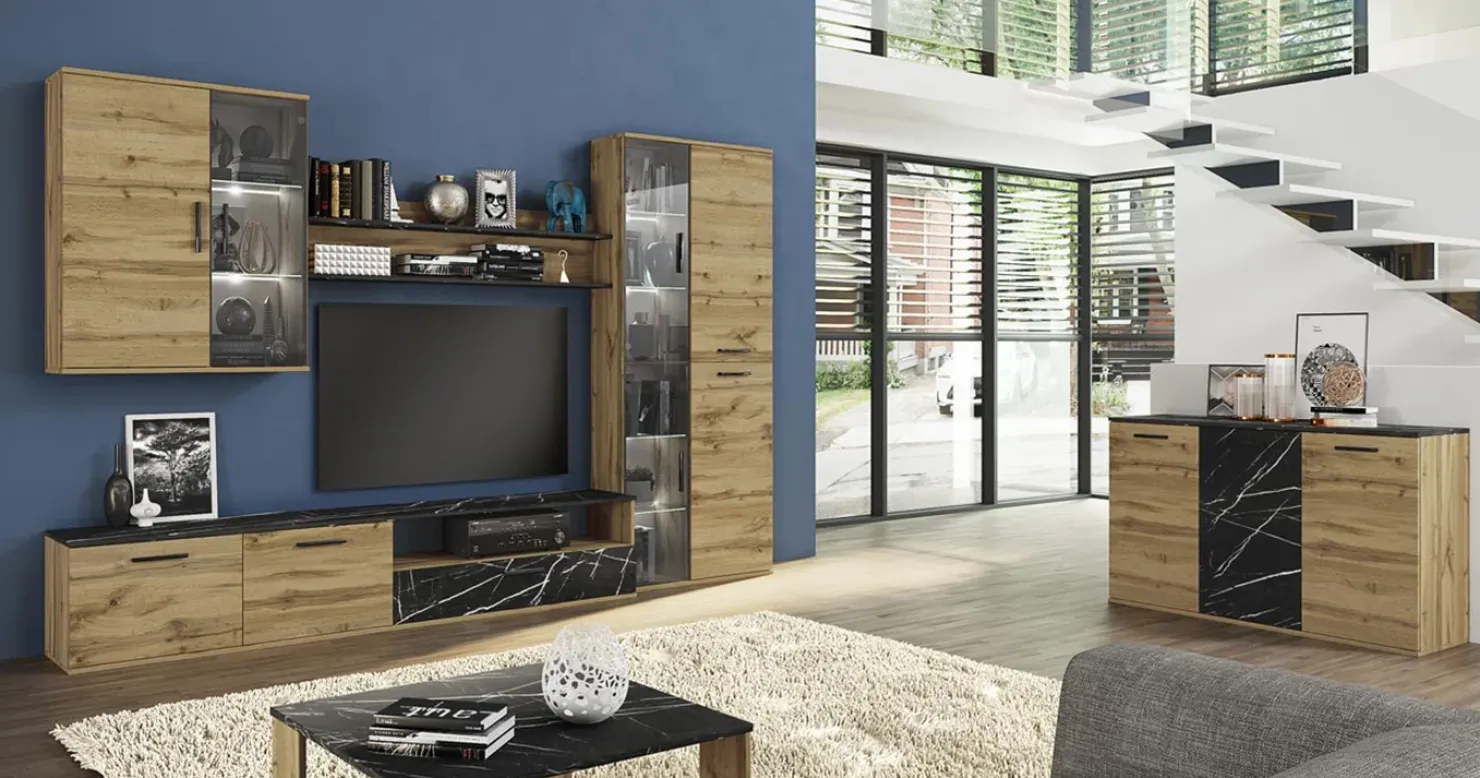 Realizzata nell’elegante finitura rovere con il frontale centrale in finitura grigio effetto marmo, è un elemento interessante per un soggiorno raffinato e moderno.