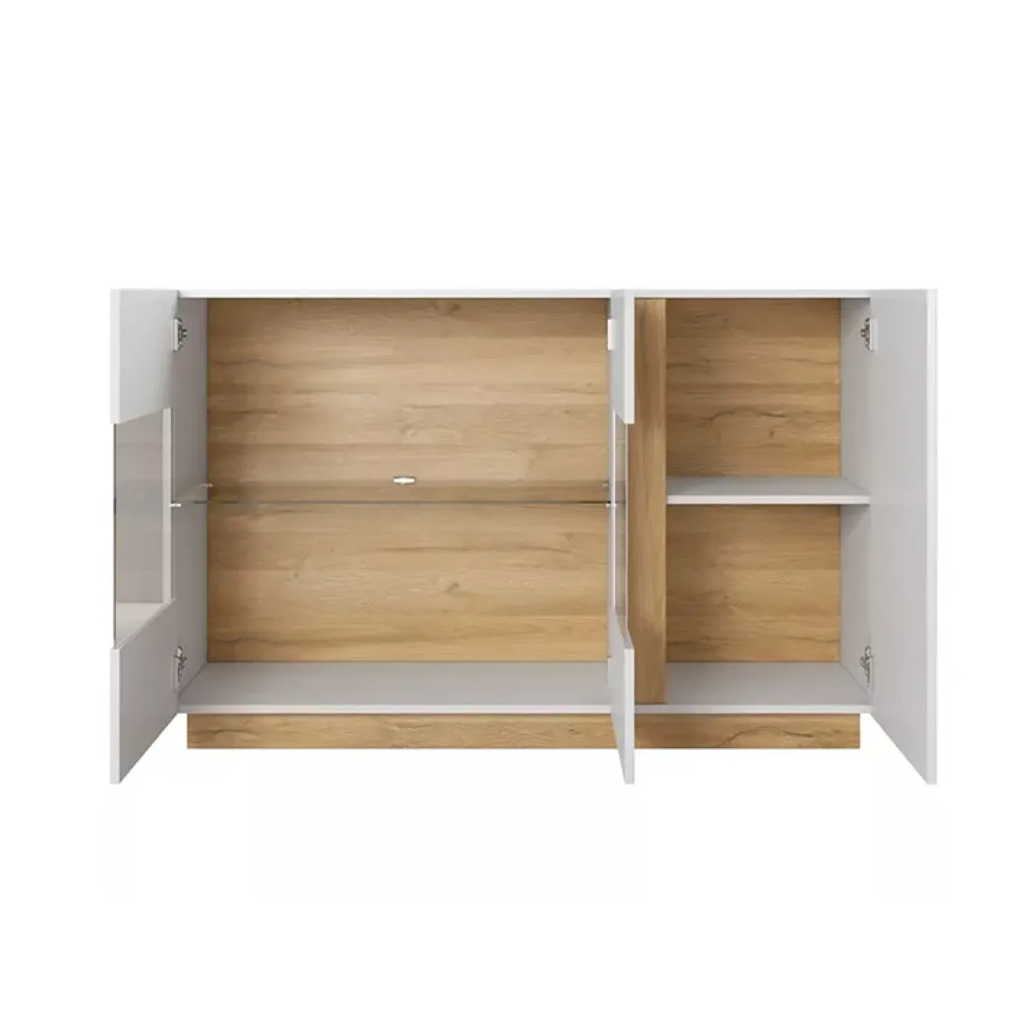 La credenza Noa Gihome® è dotata di 3 ante battenti, di cui due vetrate, che vanno a creare una vera e propria vetrina espositiva. Le ante vetrate sono dotate di apertura push-pull e racchiudono un vano contenitore diviso da un ripiano realizzato in vetro trasparente. Dietro l’anta singola, caratterizzata dall’originale e innovativo sistema di apertura con gola integrata, è presente un altro vano contenitore, anche questo con un ripiano interno. Scegliendo la luce led disponibile in opzione (vedi prodotti correlati), potrai valorizzare al massimo la vetrina della credenza e renderla davvero innovativa!
