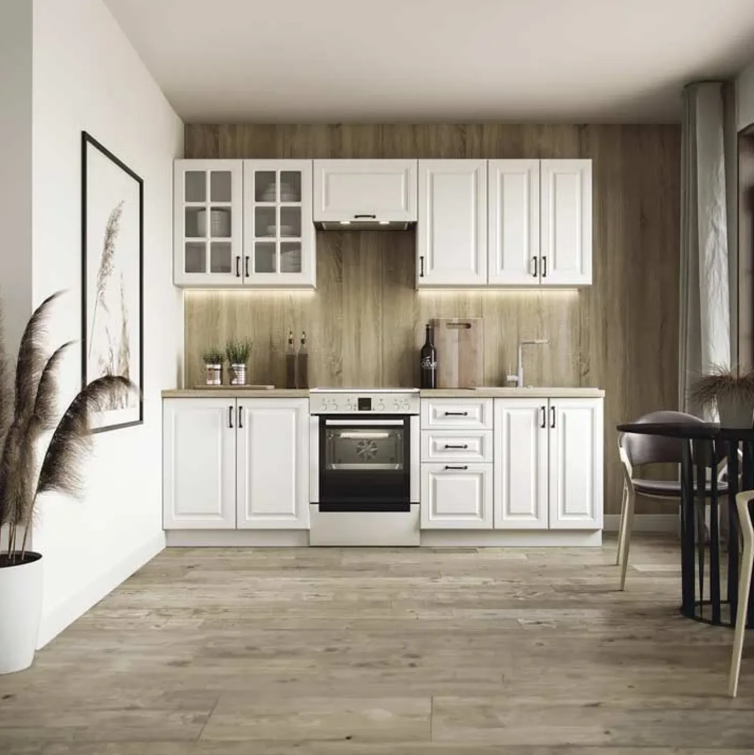 La cucina Oxford, proposta in finitura bianca con top rovere, si abbina bene a un intonaco in tonalità neutre, per illuminare l’ambiente, oppure una tinta colore pastello, per conferire un’aria romantica all’ambiente e richiamare le nuance dello stile shabby. Non sarà un azzardo nemmeno un’elegante carta da parati su una delle pareti della cucina. L’obiettivo è sempre quello di creare un’atmosfera accogliente e rilassante.