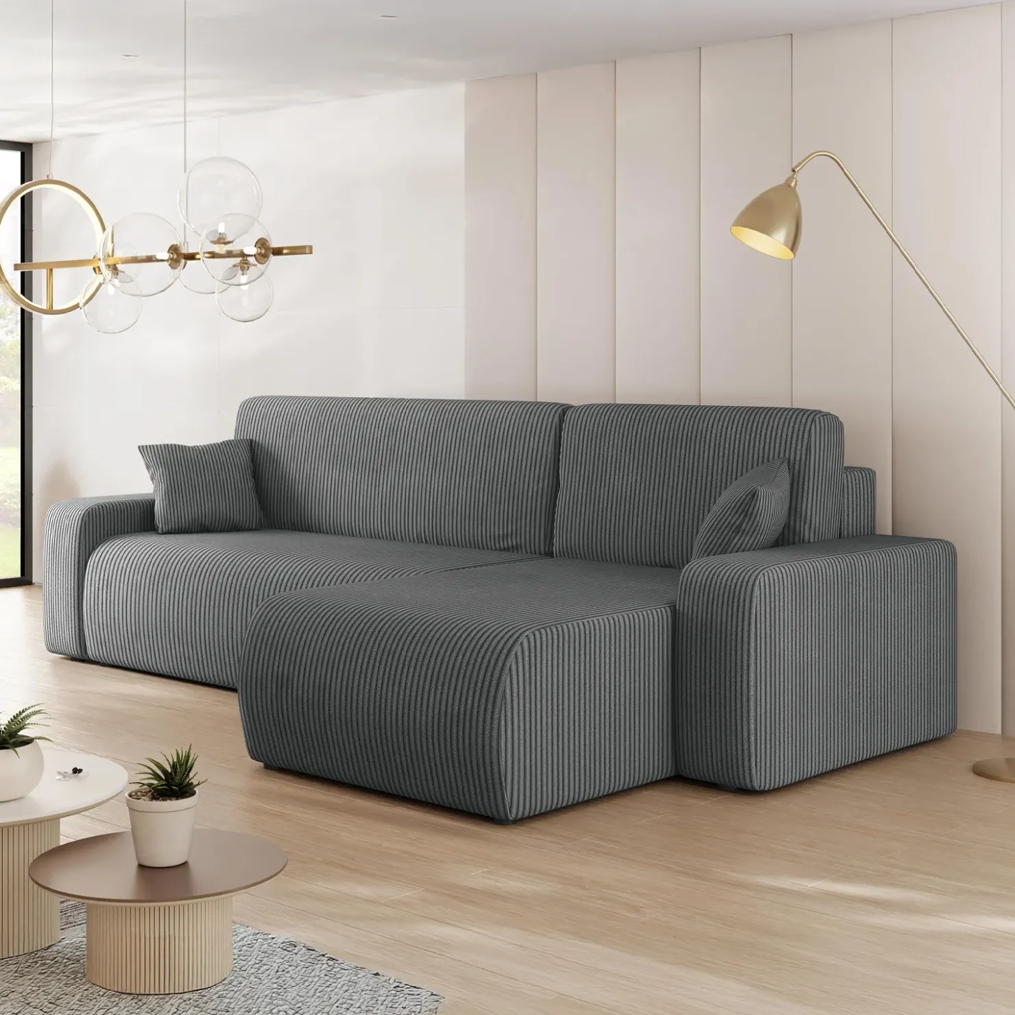 Il divano letto angolare 3 posti Slurp è la perfetta combinazione di stile moderno e funzionalità intelligente, pensato per chi desidera un ambiente accogliente e pratico allo stesso tempo. Rivestito in tessuto a coste grigio, dona eleganza e versatilità al soggiorno, adattandosi con eleganza a qualsiasi tipo di arredamento.