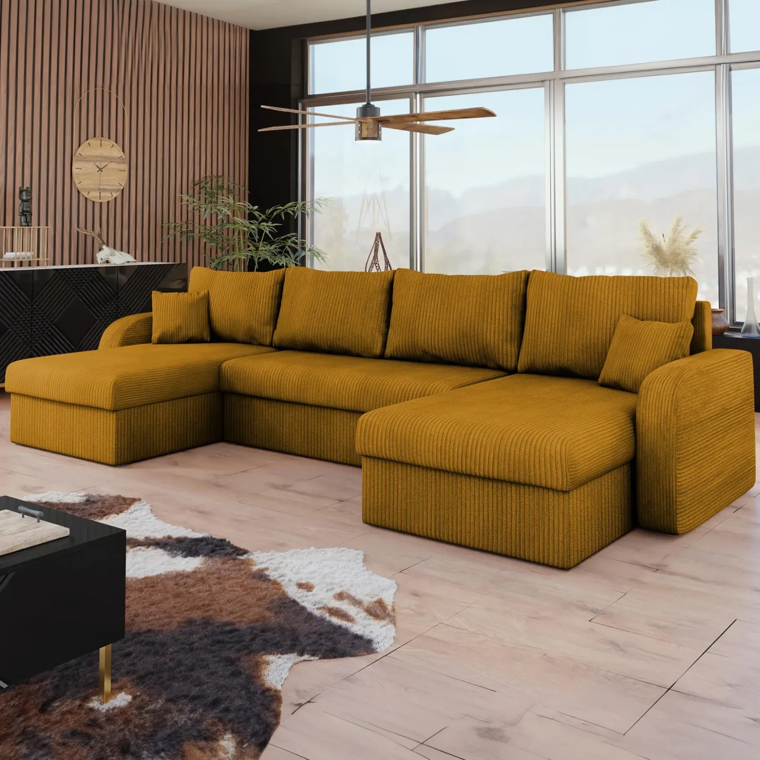 Divano letto angolare 4 posti 304cm con contenitore velluto a coste senape Assunta