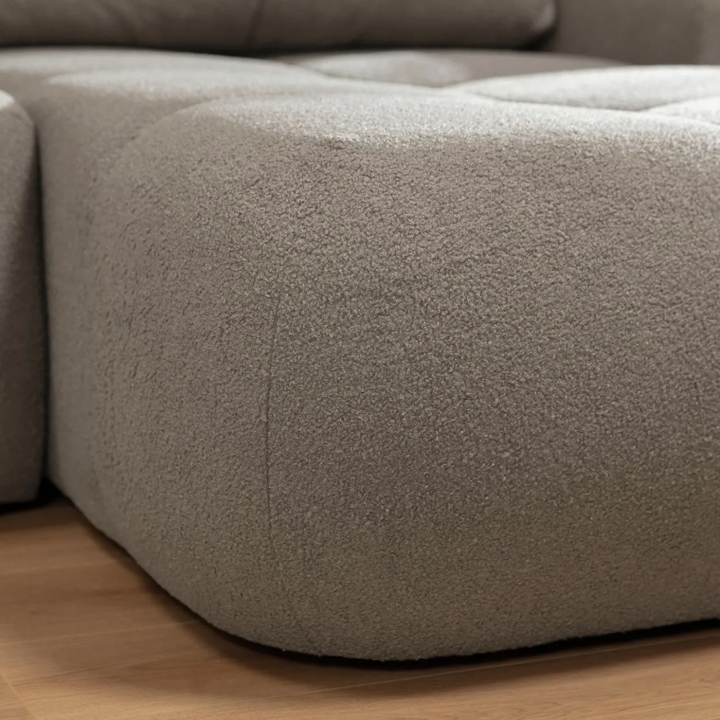 Rivestito in pregiato tessuto bouclé grigio tortora, Litos dona un tocco di eleganza raffinata al living, combinando morbidezza al tatto e resistenza all’uso quotidiano. La texture materica del bouclé esalta la profondità del colore, rendendo questo divano protagonista assoluto dello spazio.