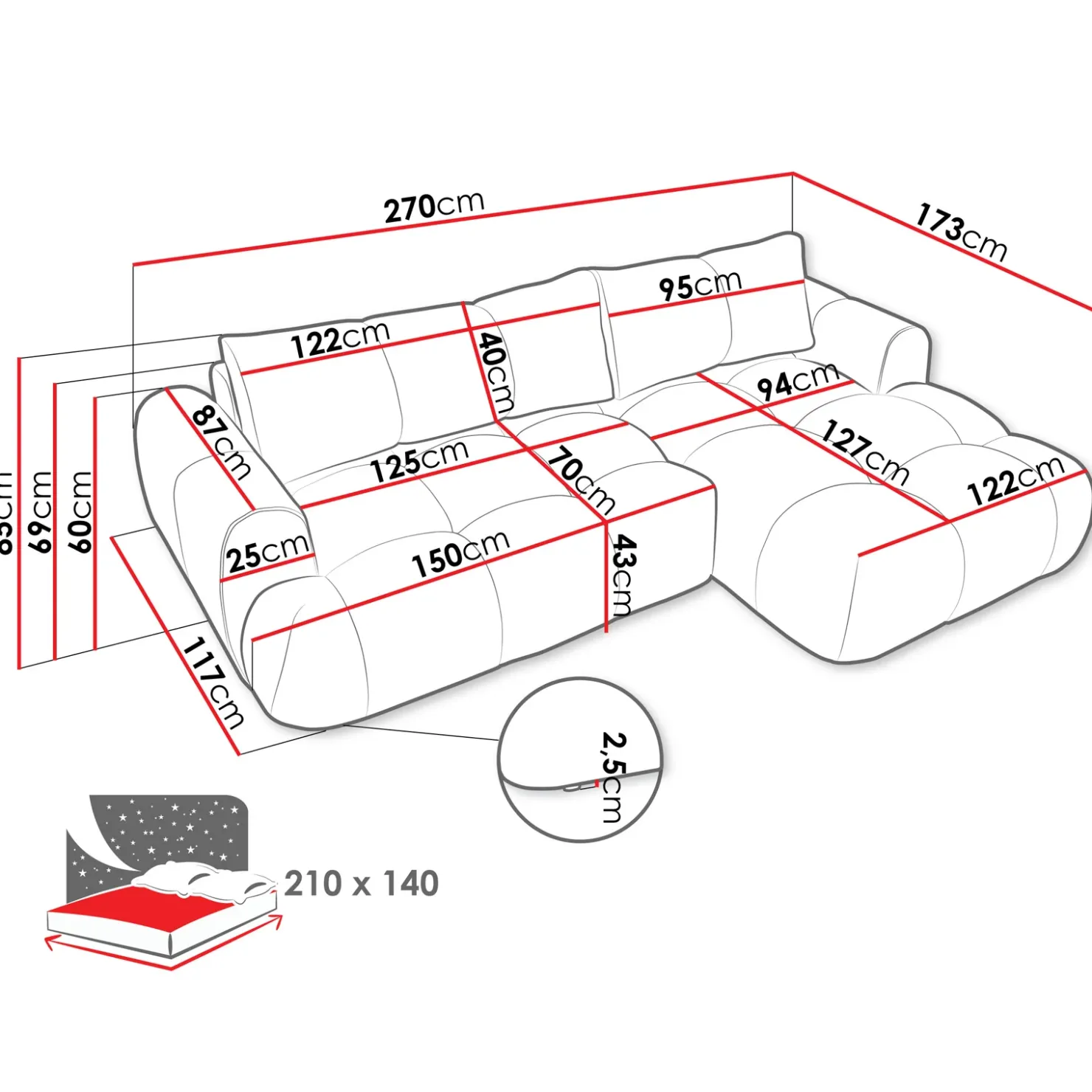 | Dimensioni | L.270 x H. 85 x P.173 cm |