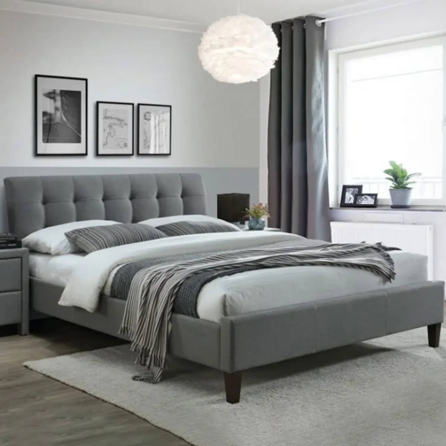 Letto in versione matrimoniale in tessuto grigio, costituito da un’elegante testiera trapuntata capitonnè e sostenuto da piedini in legno massello.