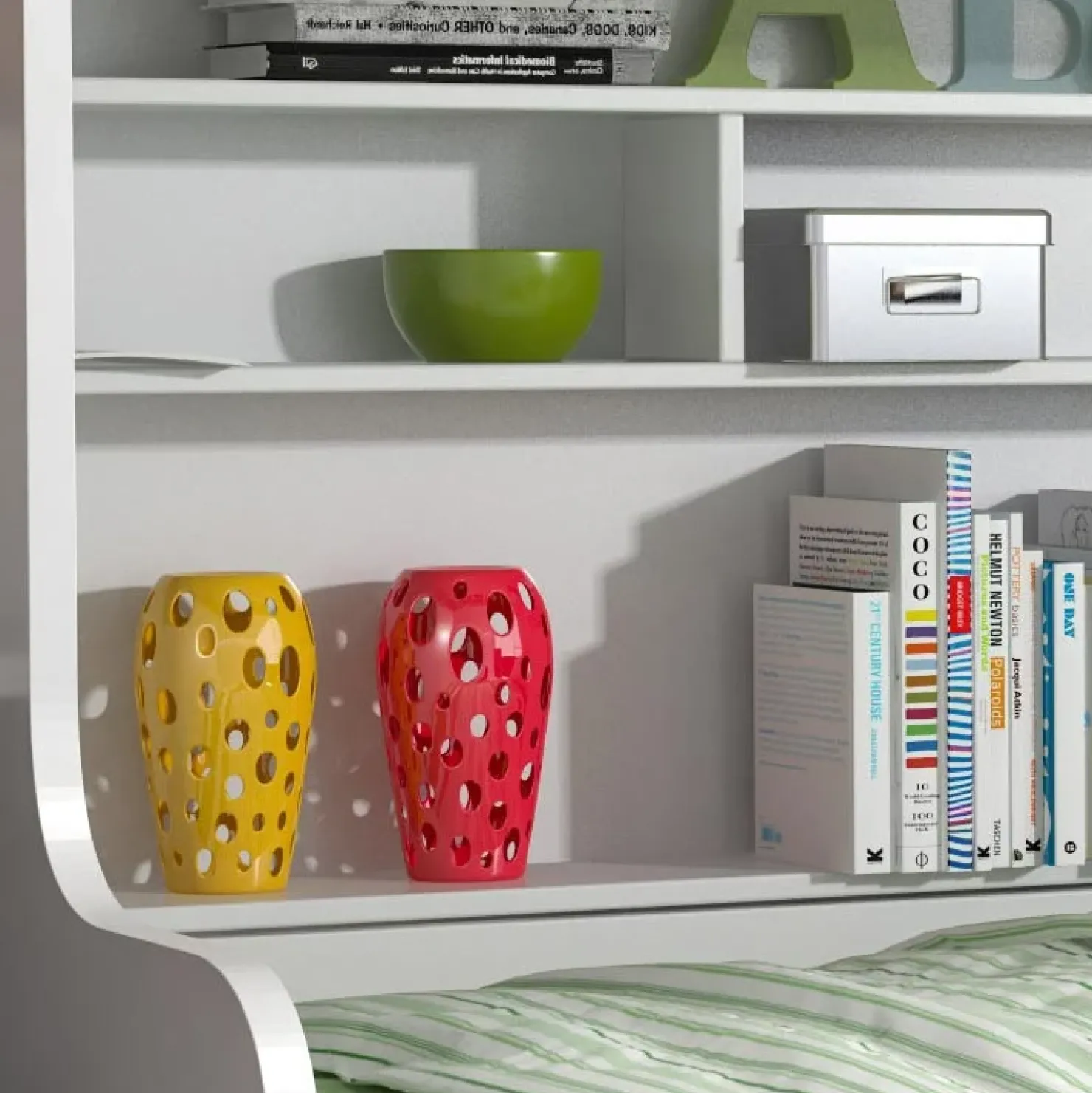 Con il letto a castello Enrico Gihome® sarà facile tenere tutto in ordine: dispone infatti di un cassettone posto sotto il letto inferiore, un ampio vano ribaltabile integrato tra la parete posteriore e il letto inferiore e una libreria con 3 vani a giorno nella parte centrale tra i due letti, ideale per sistemarvi libri, cornici e soprammobili.
