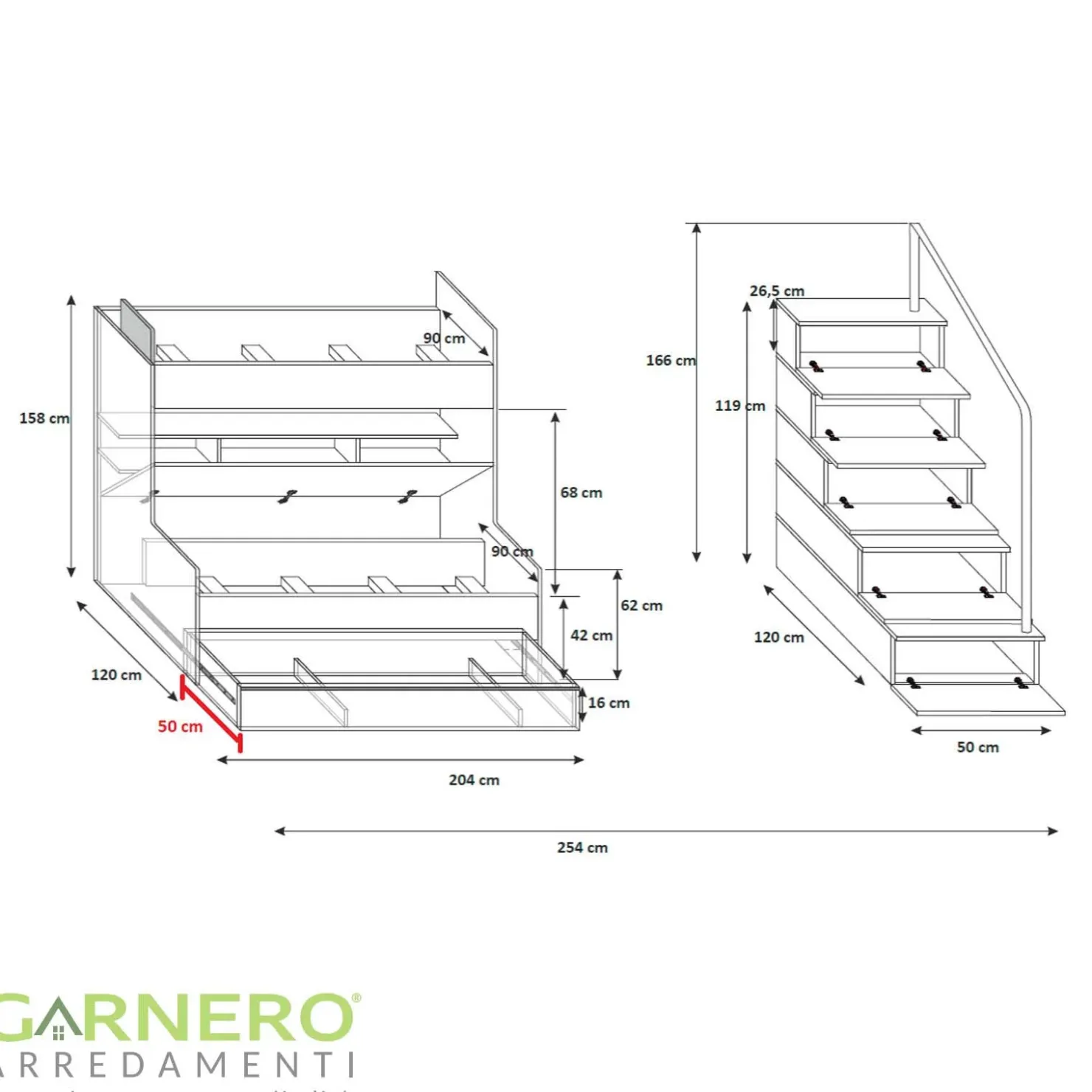 - dimensioni cameretta: L.254 x H.160 x P.120 cm