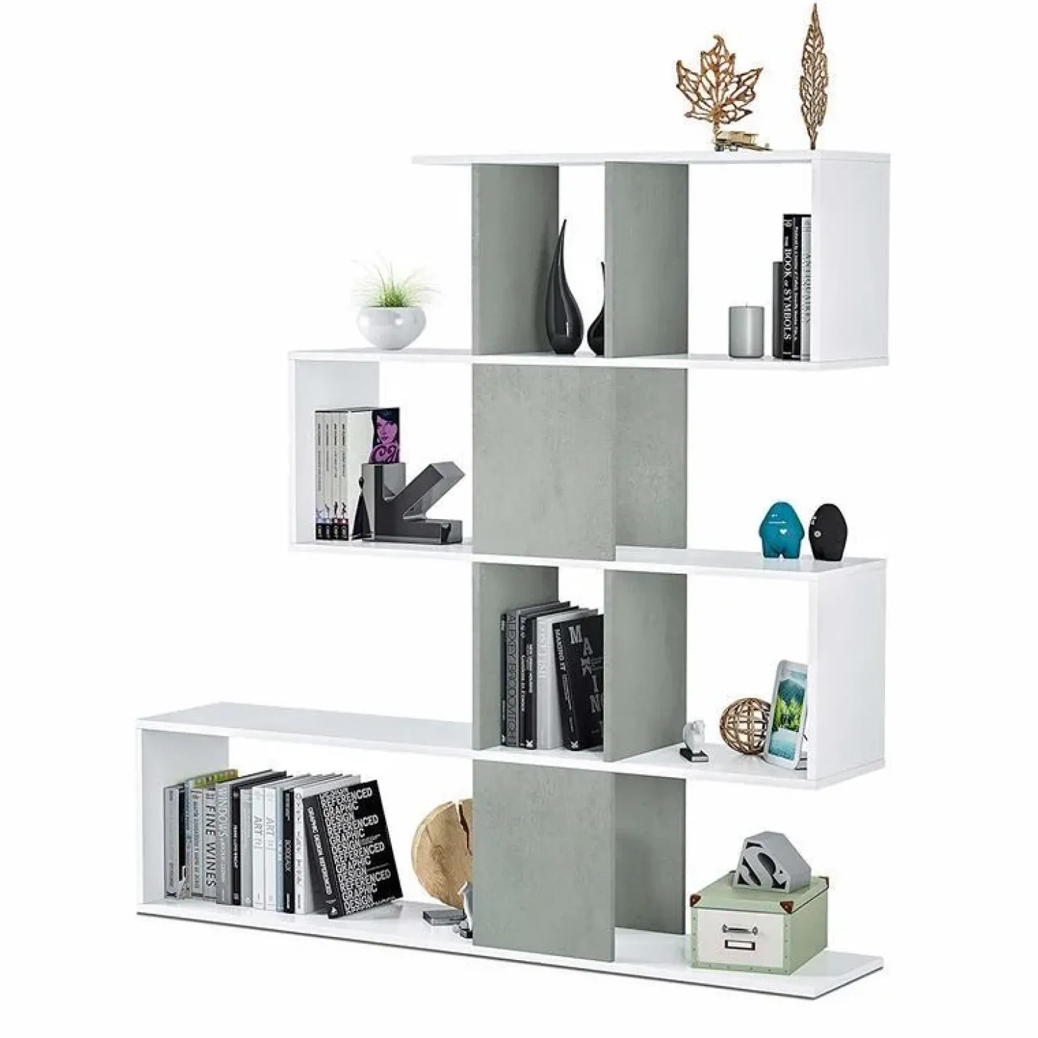 Libreria moderna Domino in finitura bianco cemento composta da 5 ripiani a zig zag con divisori sfalsati. Un must tra le librerie moderne per uno stile giovane e di tendenza.