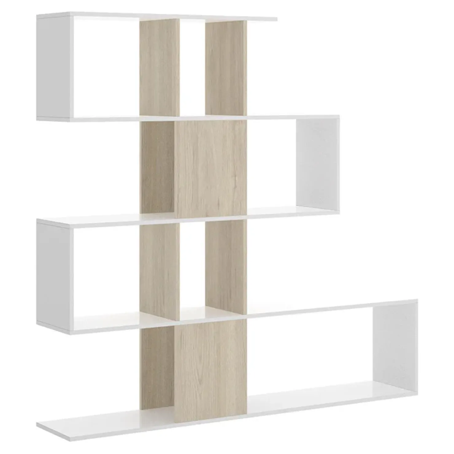 Libreria moderna Snake in finitura bianco opaco e rovere natura, composta da 5 ripiani a zig zag con divisori sfalsati. Un must tra le librerie moderne per uno stile originale e innovativo.