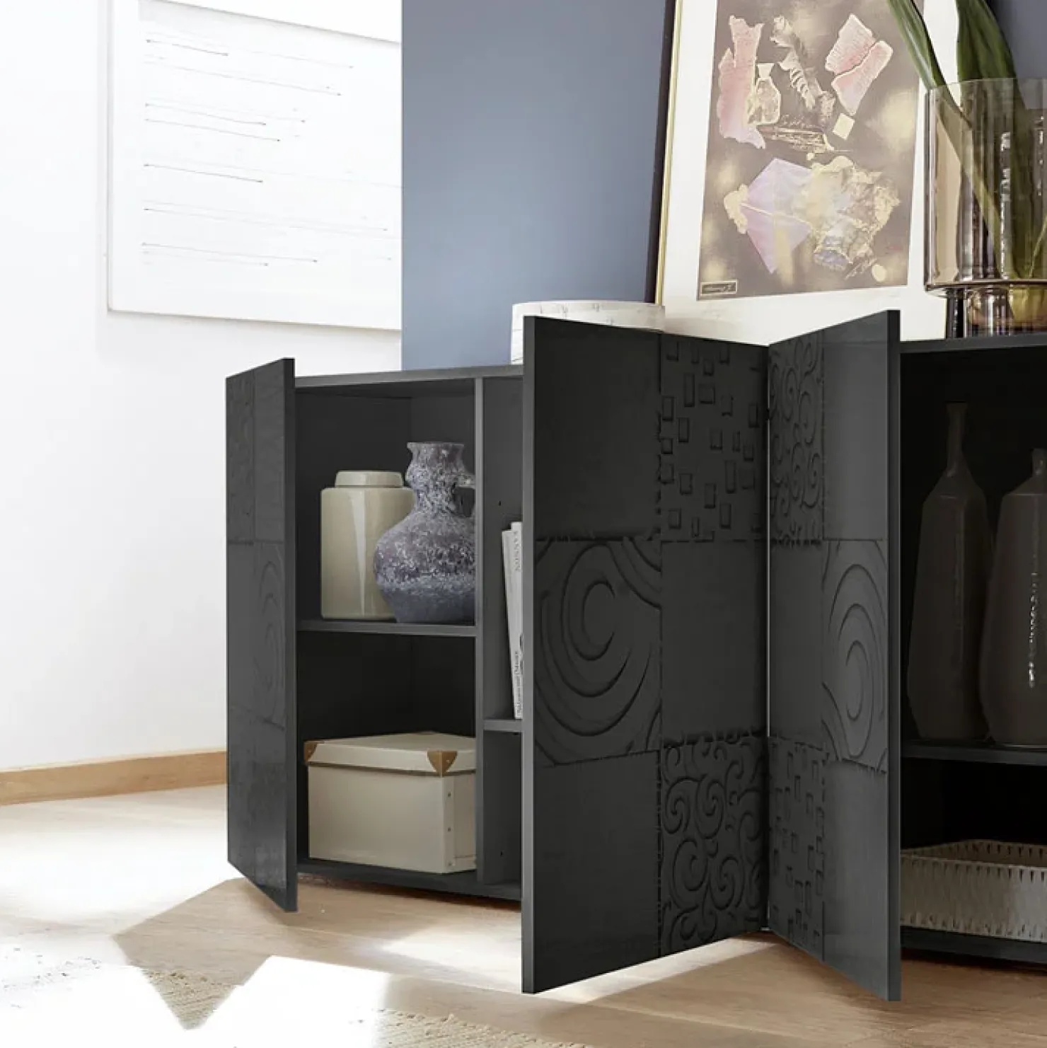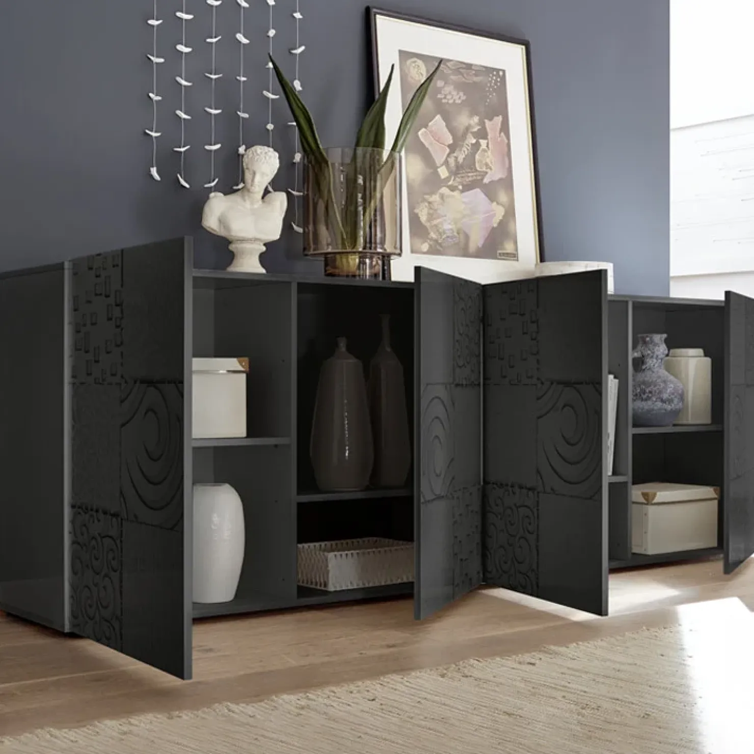 La madia moderna 4 ante Paradise è un complemento d’arredo estremamente versatile. Può essere protagonista del living, del corridoio o della zona ingresso in diversi modi: posizionandola lontano da altri elementi d’arredo già esistenti e poggiandovi su un vaso con una pianta particolarmente vistosa, si creerà un angolo davvero speciale!