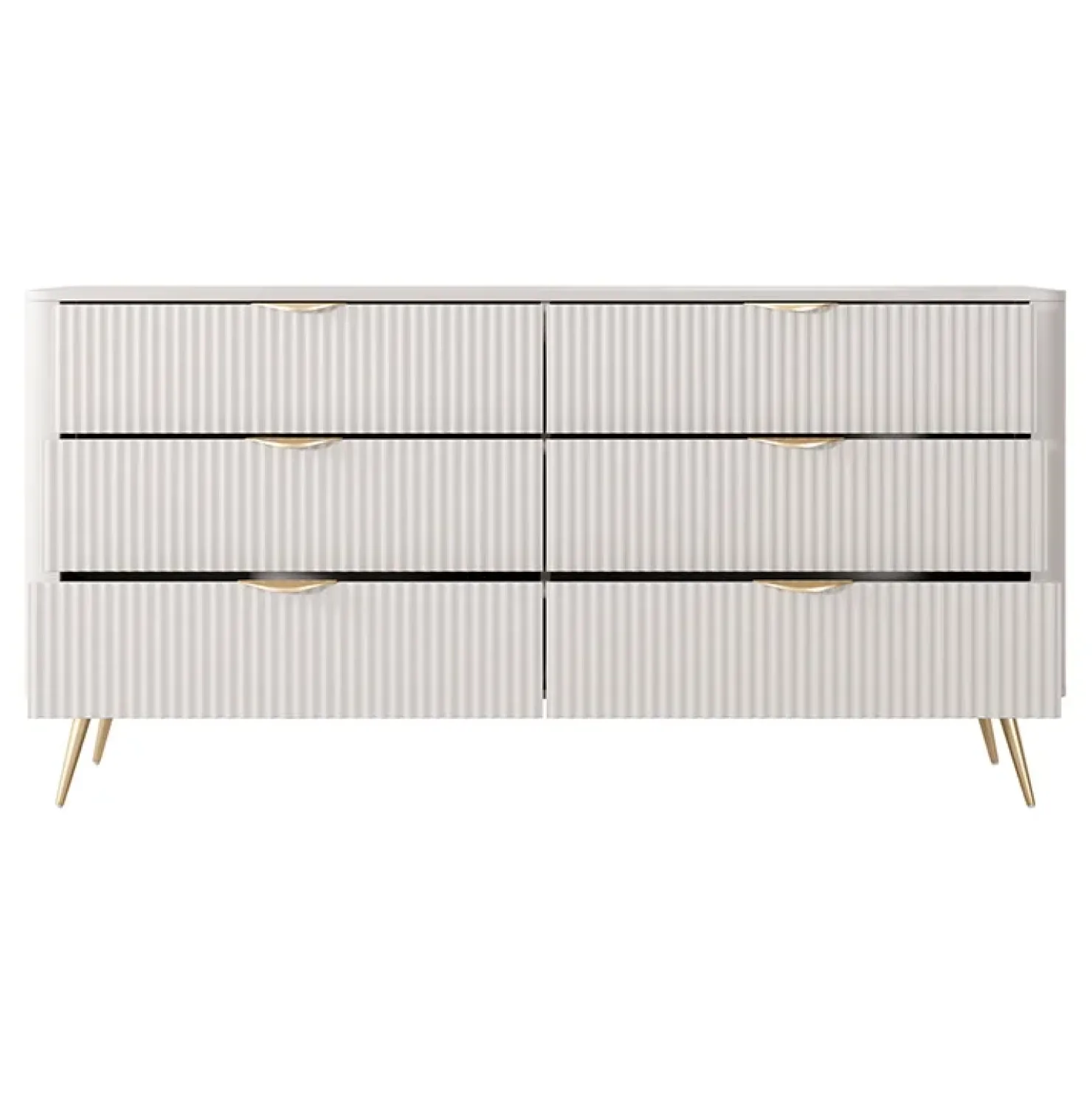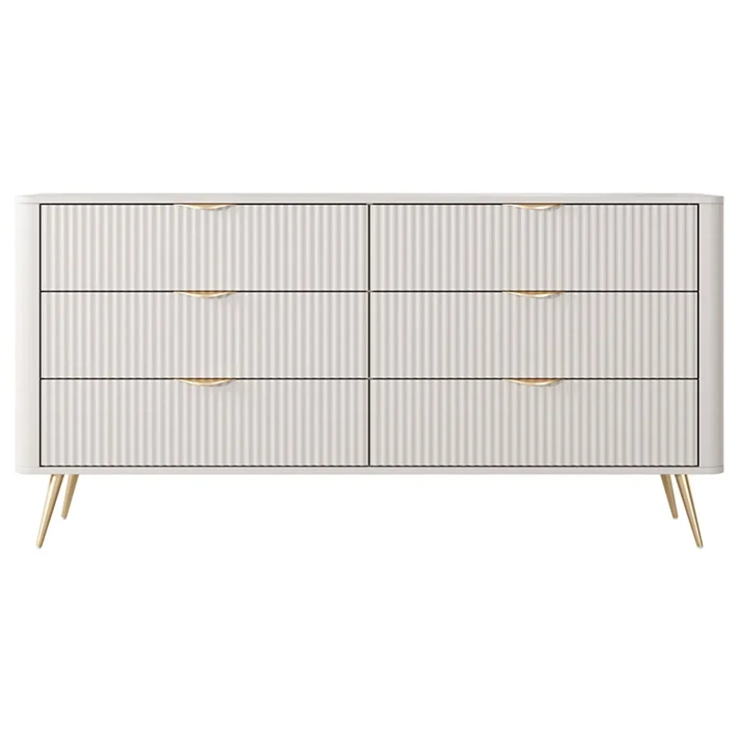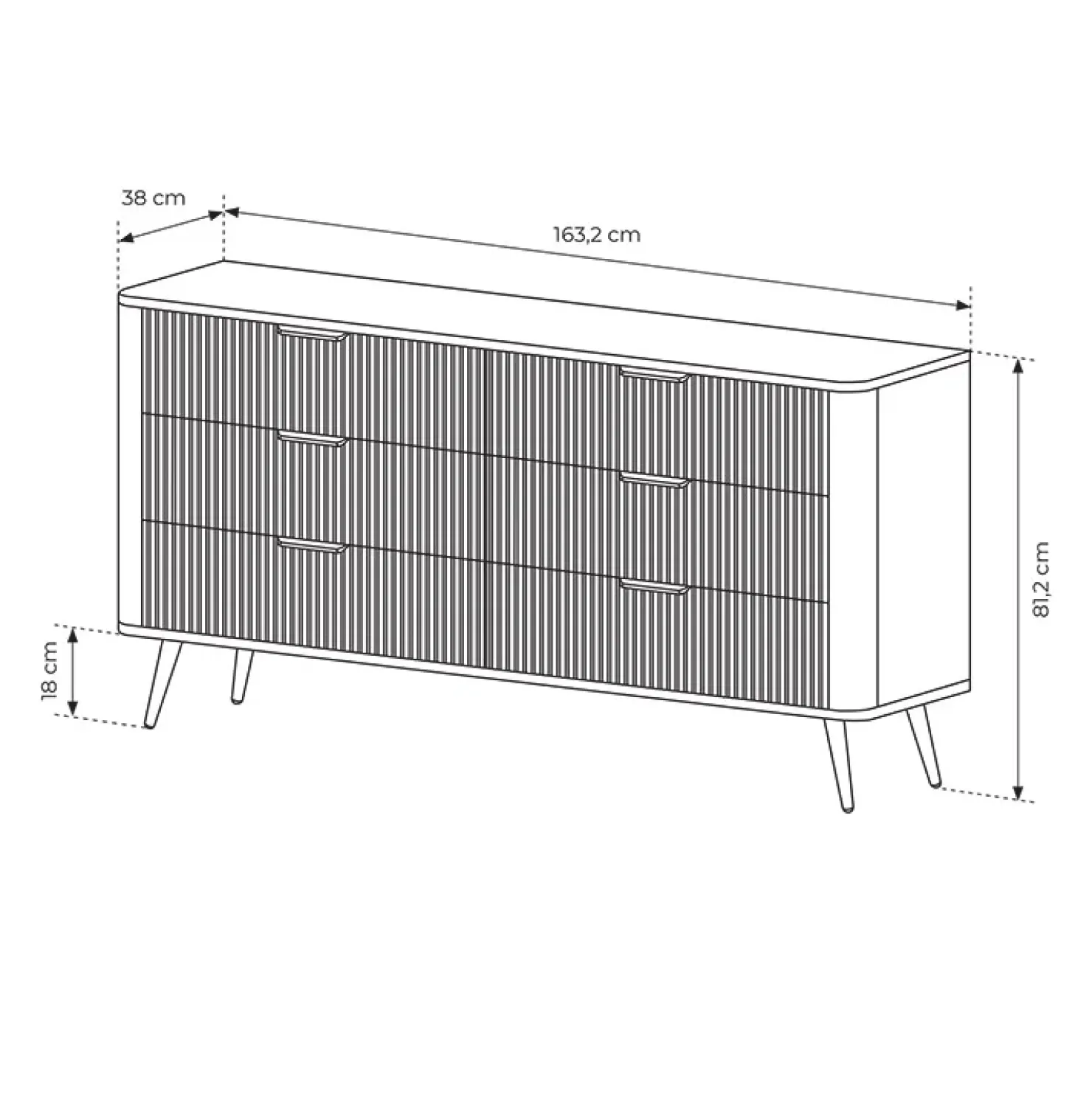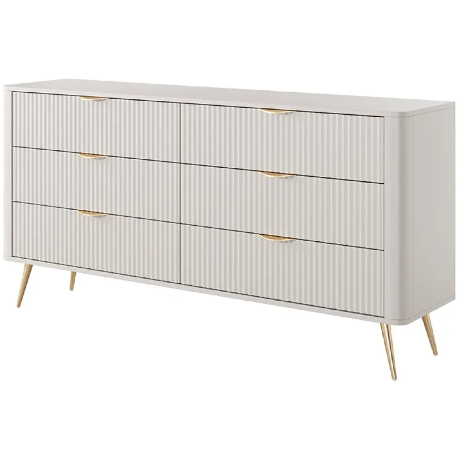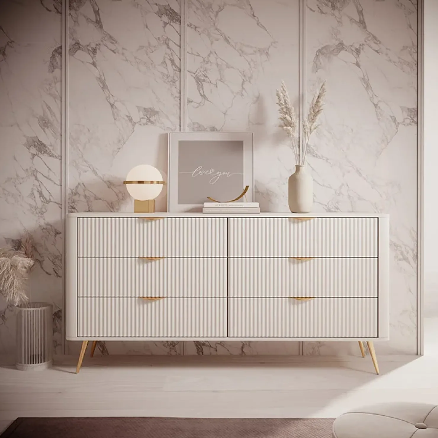 Stai cercando un mobile capiente e di carattere che aggiunga valore estettico e funzionale al tuo soggiorno? Quello che stai cercando è la Madia 6 cassetti Ramis! La sua finitura beige dona un tocco di versatilità al mobile, che si abbina così a una vasta gamma di stili e palette cromatiche! I frontali cannettati donano alla madia un look moderno e sofisticato, che aggiunge carattere e stile a qualsiasi stanza. È dotata di 6 cassetti, apribili comodamente grazie alle maniglie in metallo dorato, che offrono una soluzione se sei in cerca di un’oganizzazione ottimale. Infatti sono ottimi per riporre una vasta gamma di oggetti, come stoviglie, biancheria, documenti e accessori mantendo lo spazio ordinato e pulito. Il piano superiore della madia è ottimale per sistemare libri o riviste in modo ordinato per una lettura più accessibile o per appoggiare vasi e oggetti decorativi. La struttura poggia su piedini in metallo dorato di 18 cm che donano un aspetto più elegante e curato al mobile. La forma lineare e il design pulito la rendono adatta ai vari ambienti della casa! Il prodotto è disponibile anche in altre finiture!