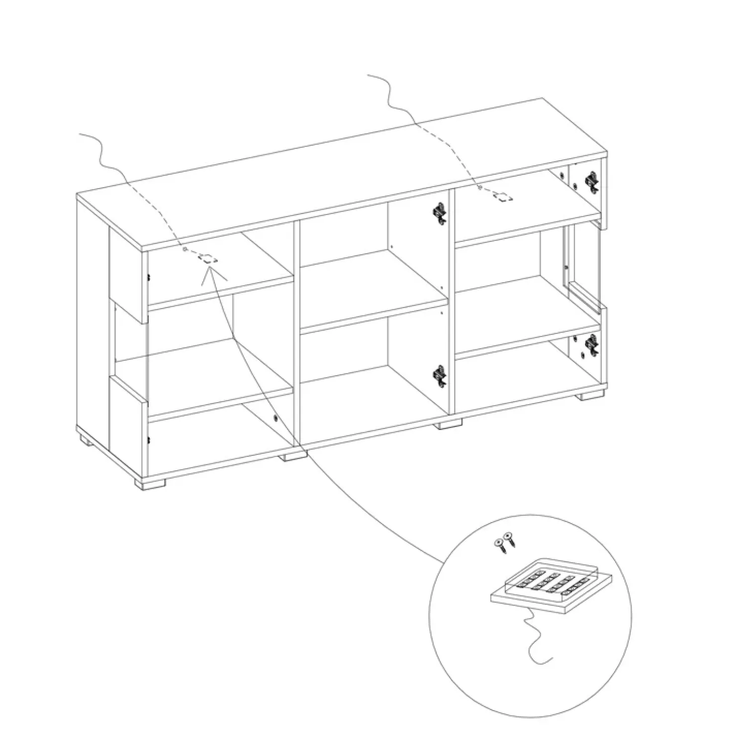 La madia moderna Fusion è dotata di: bordi ricoperti da una fascia perimetrale su tutti i lati e due ante battenti laterali, con la parte centrale di vetro trasparente, che rende visibile uno dei tre vani interni. Qui è possibile esporre i propri elementi da collezione.