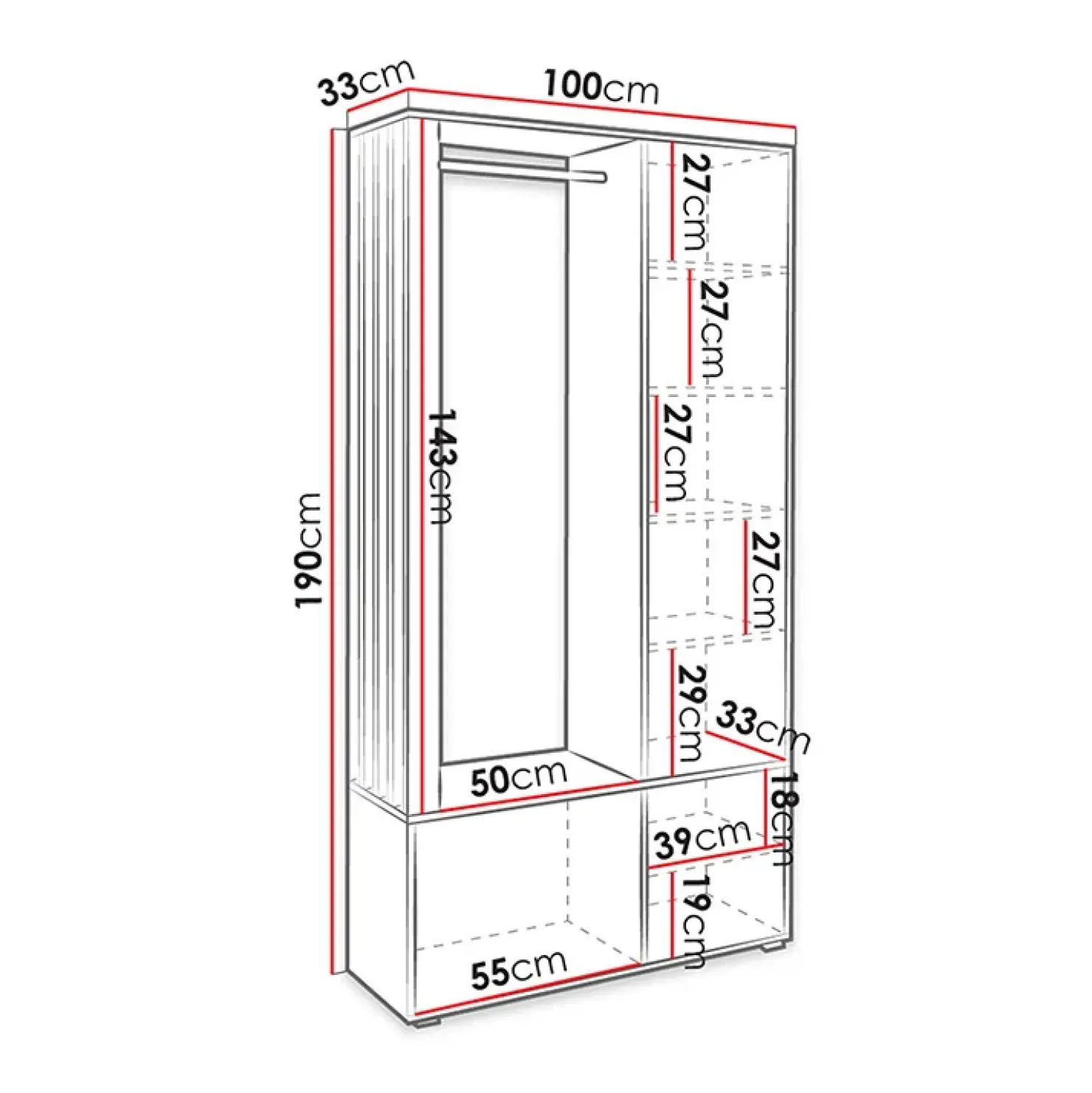 - dimensioni mobile : L100 x H190 x P33 cm