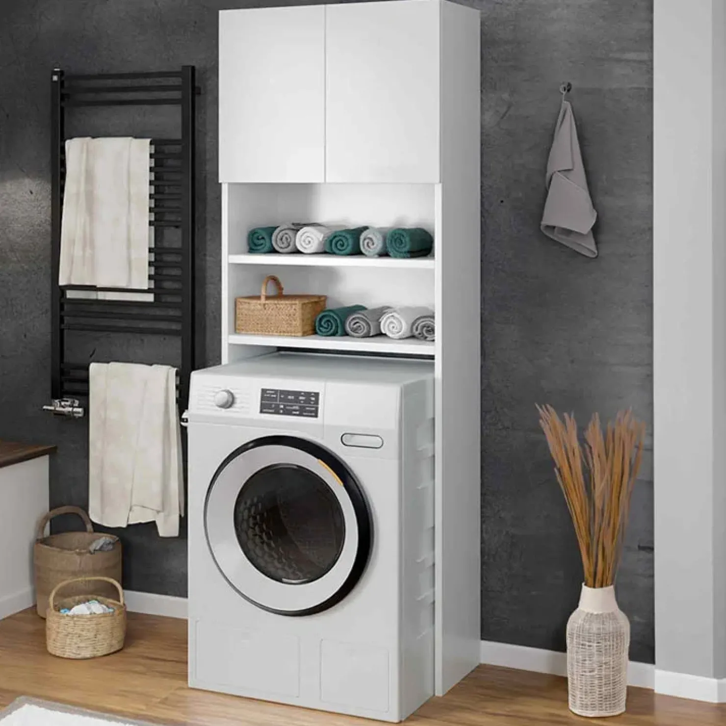 Mobile lavatrice 2 ante con ripiani 65x191cm bianco Maldive: il mobile che ti permette di avere lavatrice, detergenti e accessori per il bagno comodi all’uso.