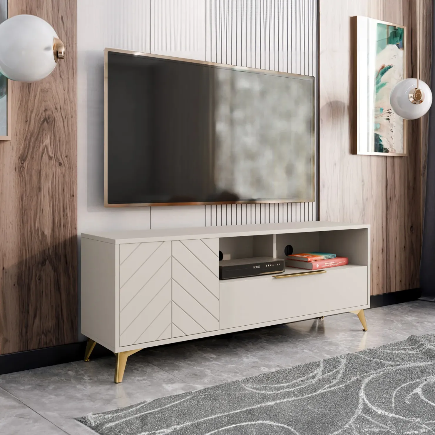 Se desideri trasformare il tuo soggiorno in un ambiente che unisce eleganza e funzionalità, il Mobile Porta TV 1 anta 1 cassetto Miriam è la soluzione perfetta per te! Con il suo design raffinato e i dettagli curati, questo mobile non è solo un complemento d’arredo, ma diventa il protagonista del tuo spazio. Caratterizzato da una sofisticata finitura beige con frontali serigrafati e da maniglie in metallo dorato, il mobile presenta due cassetti a frontale unico, ideale per riporre telecomandi, occhiali o piccoli accessori, mantenendo tutto in ordine e a portata di mano. È dotato di un’anta che si apre su un ampio vano interno, ideale per riporre giochi da tavolo, libri e accessori per la casa, offrendo così un soggiorno sempre ordinato. L’anta è facilmente apribile tramite il comodo meccanismo push to open. I due vani a giorno sono perfetti per esporre la tua console di gioco, decoder e altri dispositivi elettronici, rendendo il mobile sia funzionale che decorativo. Il mobile è dotato di fori passacavi, progettati per gestire ordinatamente i cavi della TV e degli altri apparecchi, mantenendo un aspetto pulito e funzionale. Il piano superiore è perfetto per accogliere la tua TV e offre spazio per esporre decorazioni personali: immagina di posizionare vasi con piante verdi, fotografie incorniciate o un elegante orologio da tavolo. Il mobile poggia su eleganti piedini in metallo dorato che non solo assicurano stabilità, ma aggiungono anche un tocco di sofisticatezza al design contemporaneo. Scegli il Mobile Porta TV 1 anta 1 cassetto Miriam: un elemento che combina bellezza e praticità, perfetto per arricchire il tuo soggiorno e riflettere il tuo stile unico!