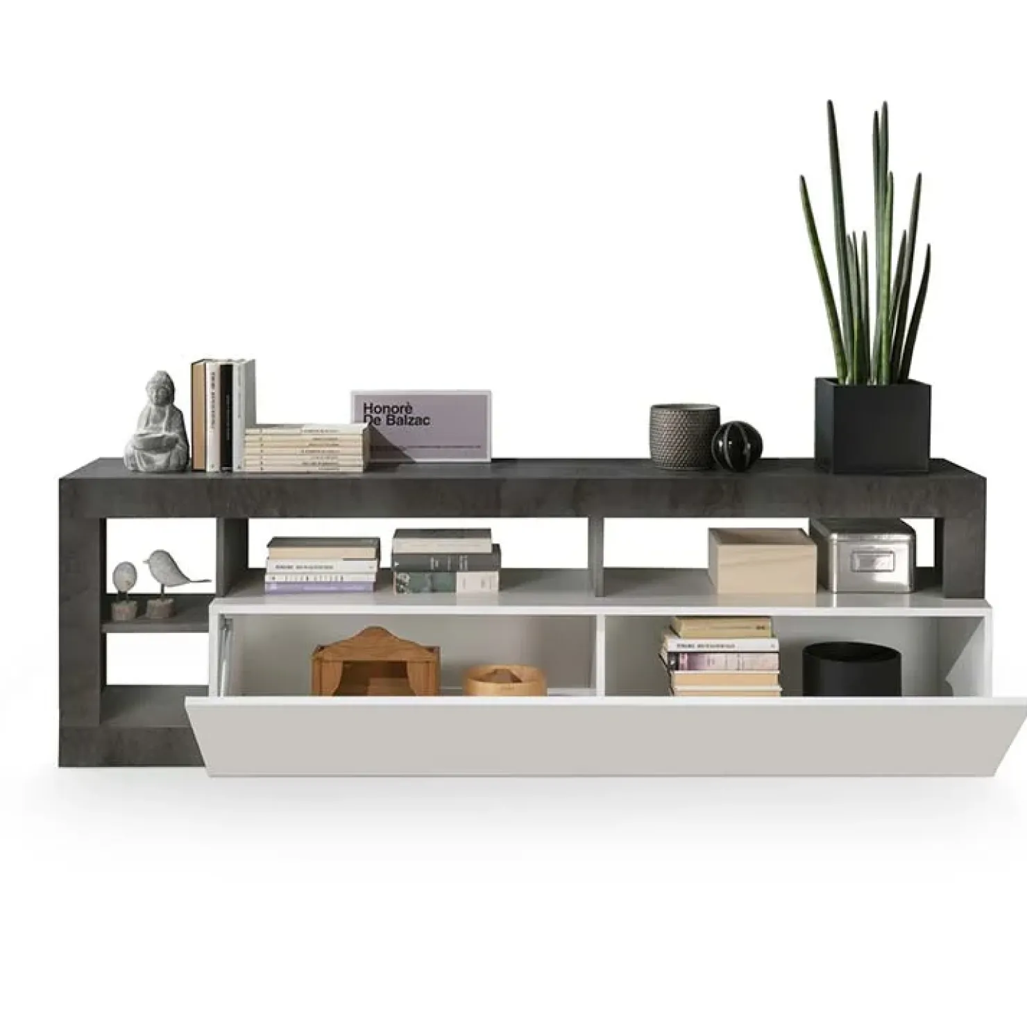 Caratterizzato da un’anta a ribalta con quattro vani a giorno, è utile per riporre tutti gli accessori multimediali.