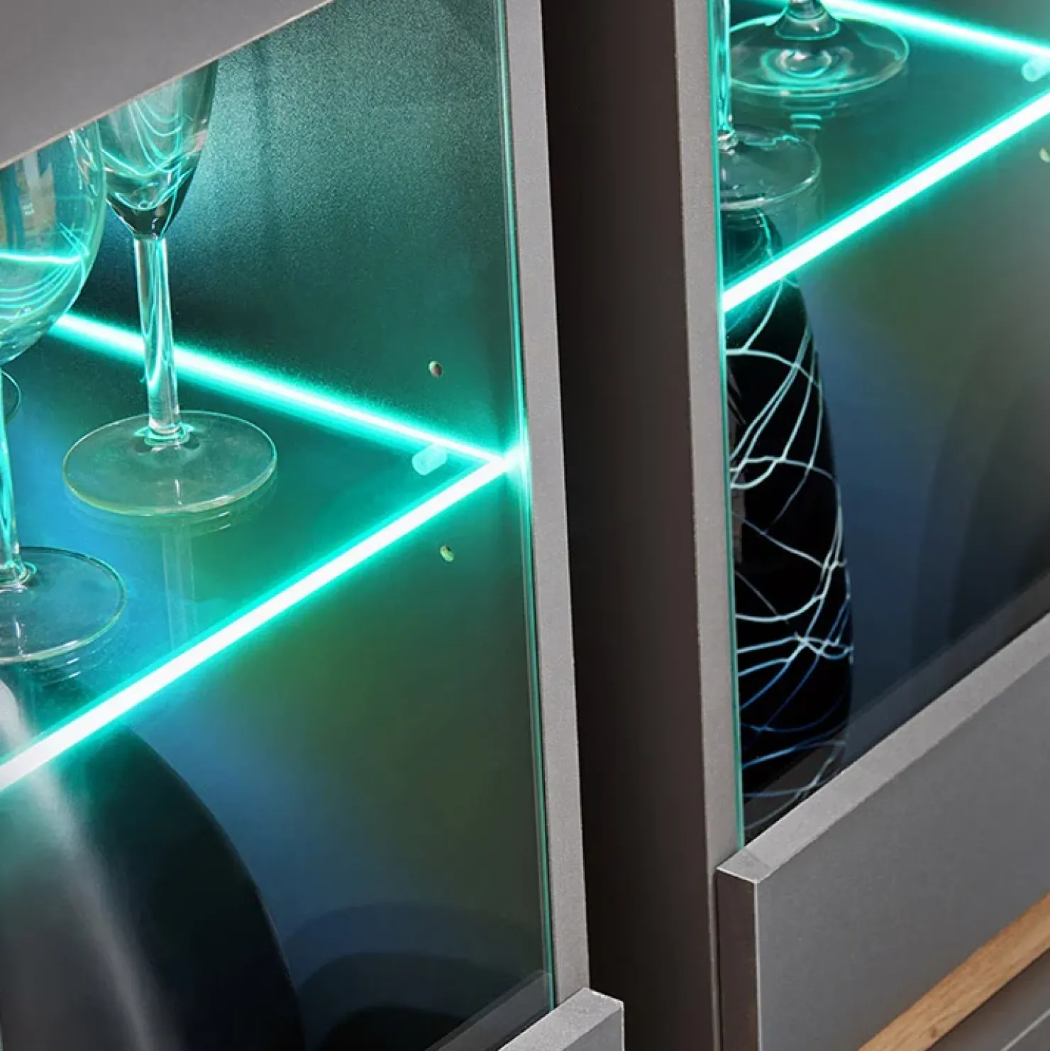 Essa è composta da due vetrine dotate di un’anta con vetro e due mensole interne, un mobile porta TV munito di due cassetti laterali e al centro due vani a giorno e infine da una mensola antracite. Ad arricchire la composizione il set led incluso che saprà creare un ambiente unico nella vostra sala.
