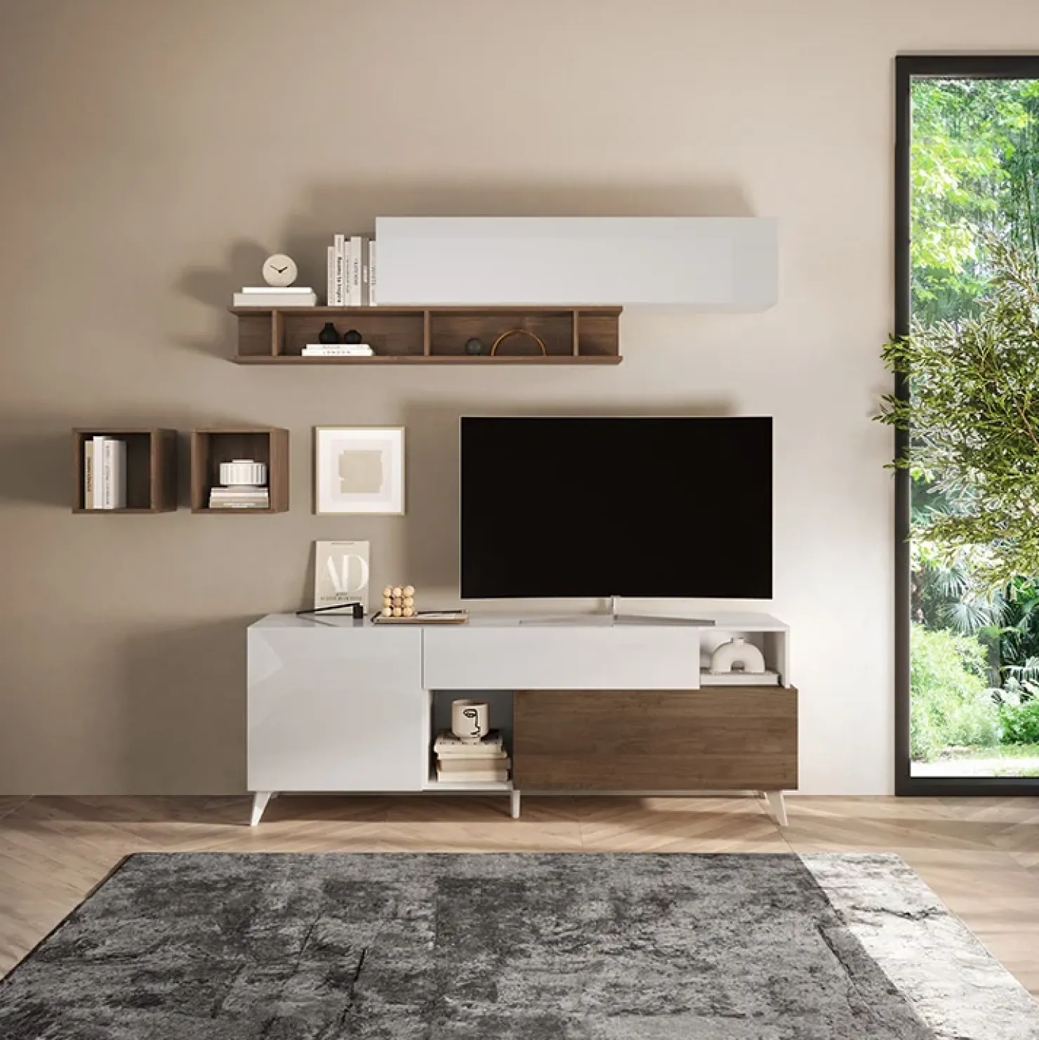 Parete attrezzata 181x205cm moderna bianco lucido rovere scuro Witty, la scelta giusta in fatto di estetica e funzionalità.