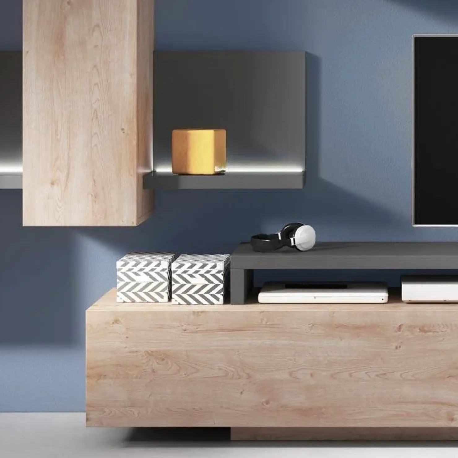 Minimal ed essenziale, con la sua forma geometrica il mobile tv conferisce dinamismo e ritmo alla parete attrezzata. E’ composto da un robusto ripiano antracite di spessore 38 mm che circonda la struttura color rovere, composta internamente da due cassetti a frontale unico. Il ripiano antracite crea dei vani a giorno dove potrai collocare i vari dispositivi elettronici collegati alla tv.