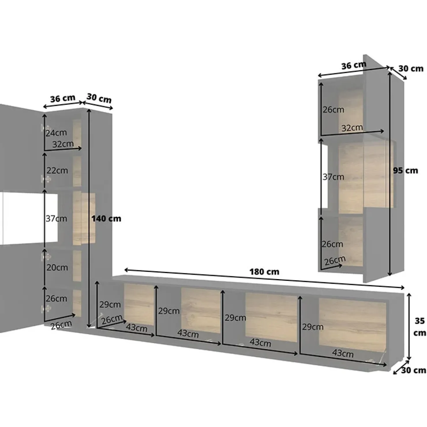 La parete attrezzata è dotata di: vetrina da parete 36x140cm bianco rovere Fusion, mobile porta tv moderno 180x35cm bianco Fusion e vetrina da parete sospesa 36x95cm.