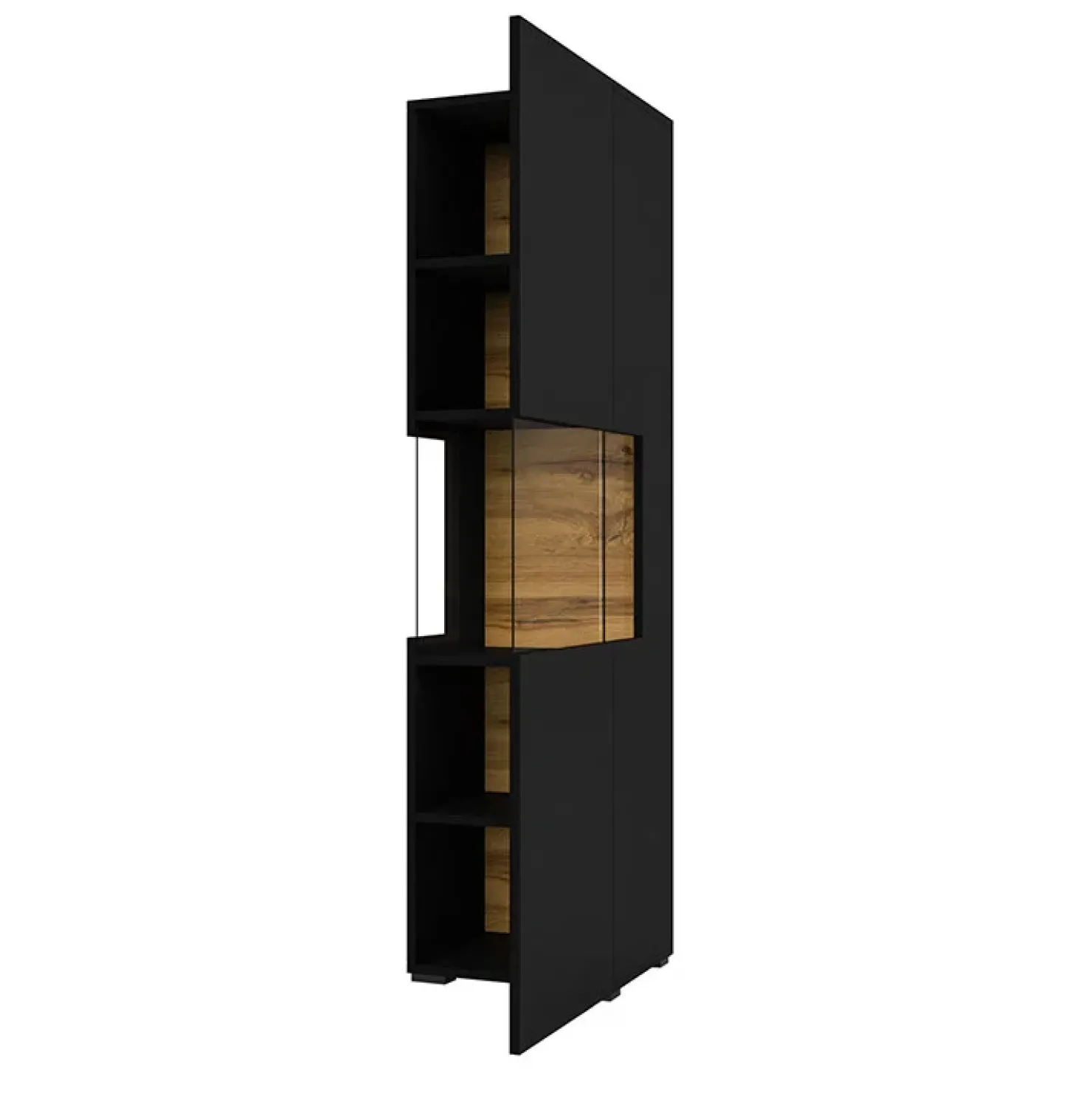 La vetrina è costituita da bordi ricoperti da una fascia perimetrale su tutti i lati; un’anta battente con la parte centrale in vetro trasparente da cui è possibile vedere uno dei cinque vani interni. Possibilità di montaggio dell’anta reversibile, in base alle proprie esigenze, sia a destra che sinistra.
