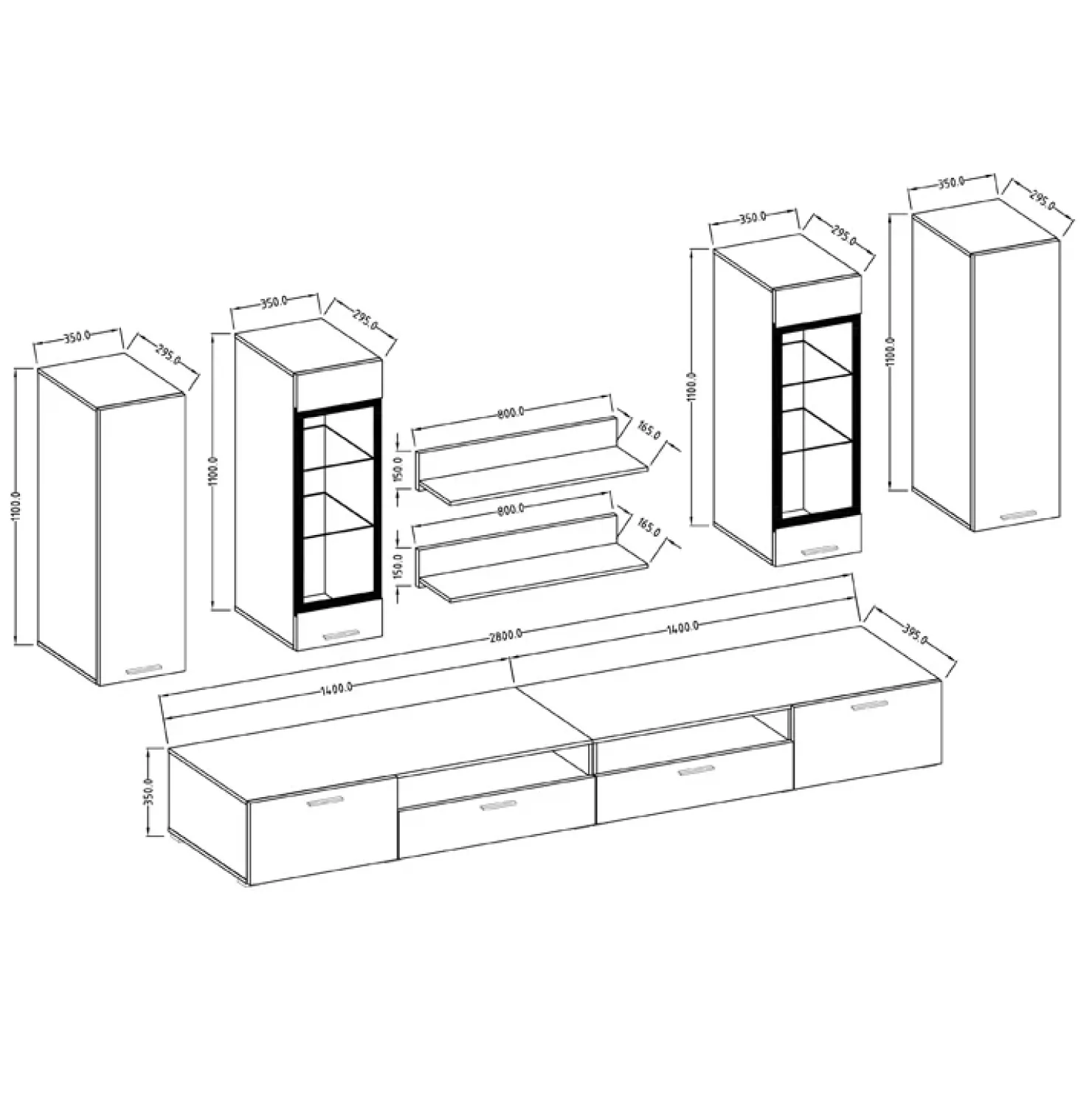 Parete attrezzata soggiorno 280x190cm rovere nero Glamour Gihome®: una composizione perfetta per chi vuole sfruttare al massimo gli spazi, ideale per un soggiorno moderno ed elegante.