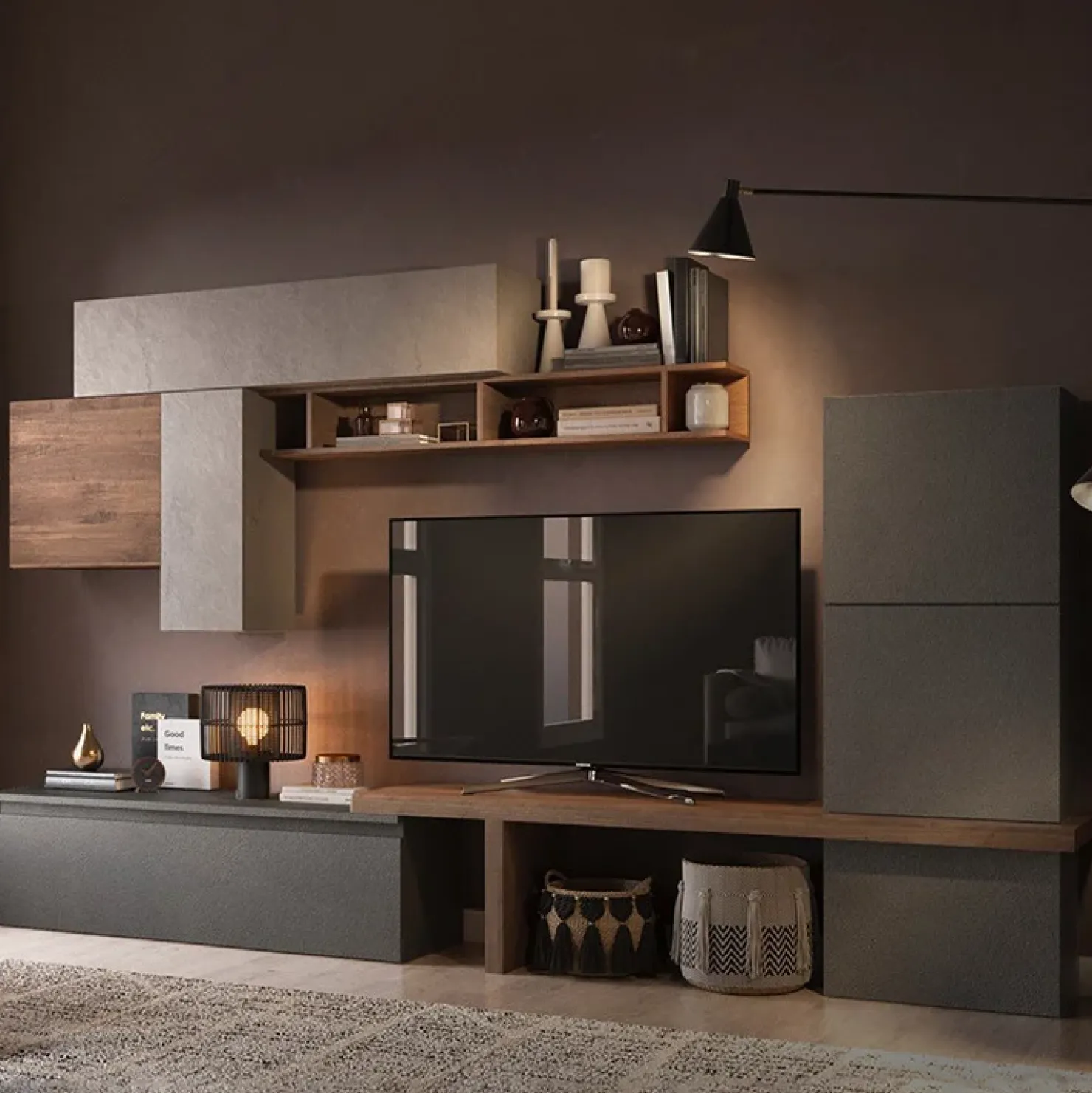 Sunset combina 1 pensile orizzontale sospeso diviso in 2 vani, per il quale potrai scegliere in fase di montaggio se optare per anta a ribalta o a vasistas, 1 pensile verticale, 3 cubi chiusi da un’anta battente che nascondono due ripiani ciascuno, 1 cubo a terra, 1 mensola con alcuni vani a giorno, 1 mensola bassa ed infine 1 mobile porta tv con cassettoni per riporre tutte le apparecchiature elettroniche.