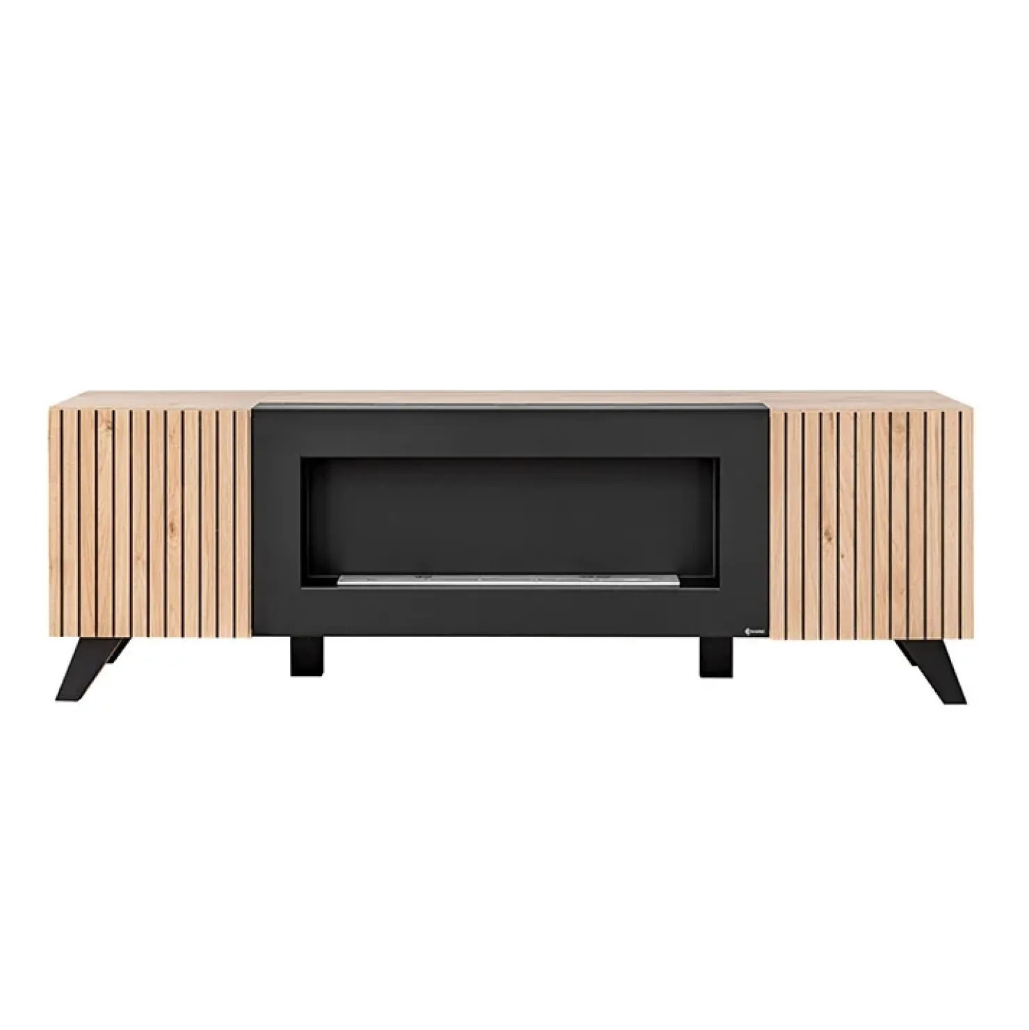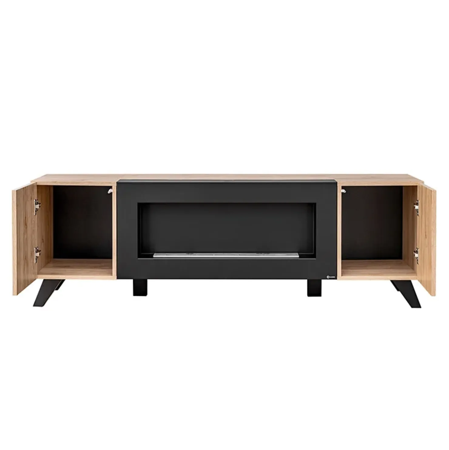 La parete attrezzata Mendes presenta una vetrinetta con 5 ripiani a giorno e 5 nascosti, un mobile porta tv con due vani nascosti ed un biocamino, una mensola ed una credenza con 3 vani a giorno e 3 nascosti.