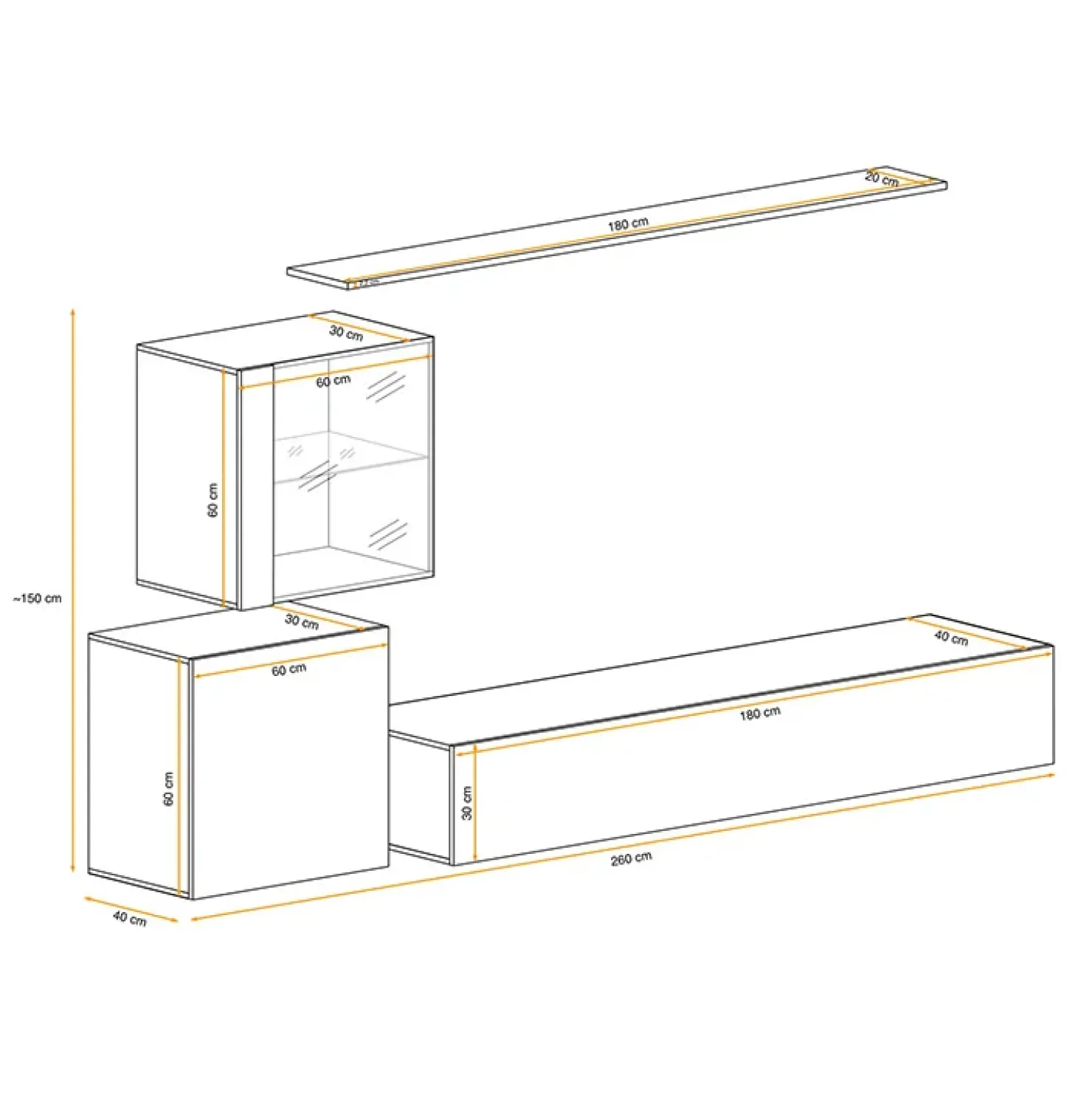 - dimensioni porta tv: L.180 x H.30 x P.40 cm