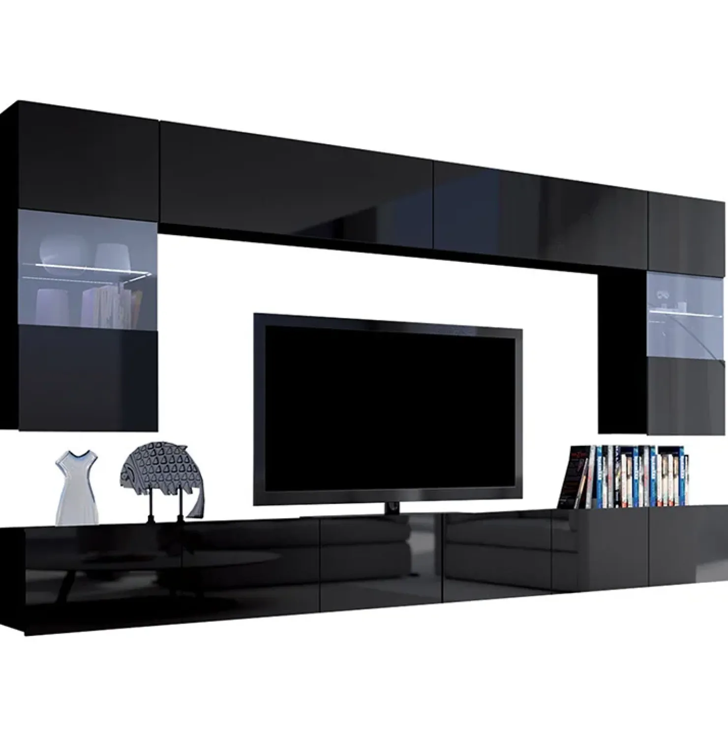 Parete attrezzata 300x180cm sospesa nero lucido Mons, elegante e senza tempo