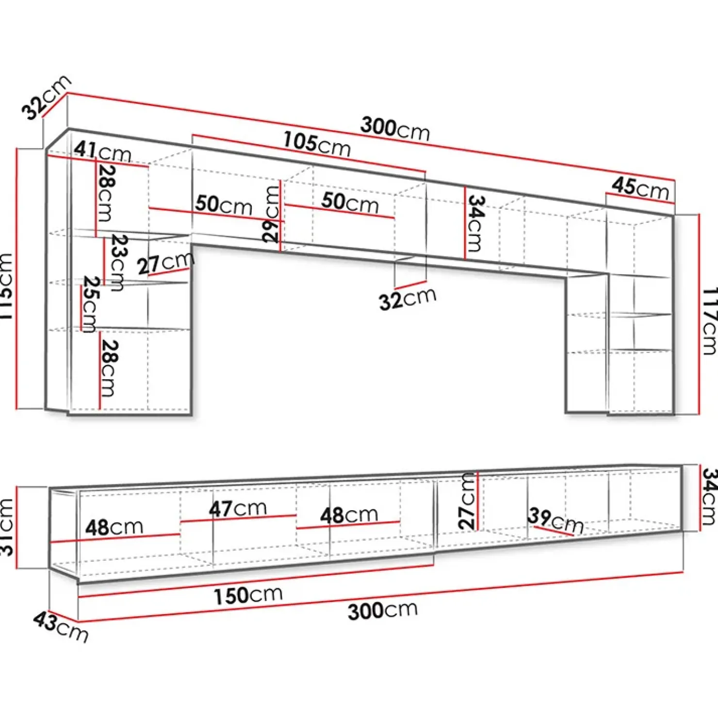 - dimensioni mensola sospesa (x2): L105 X H34 X P32 cm