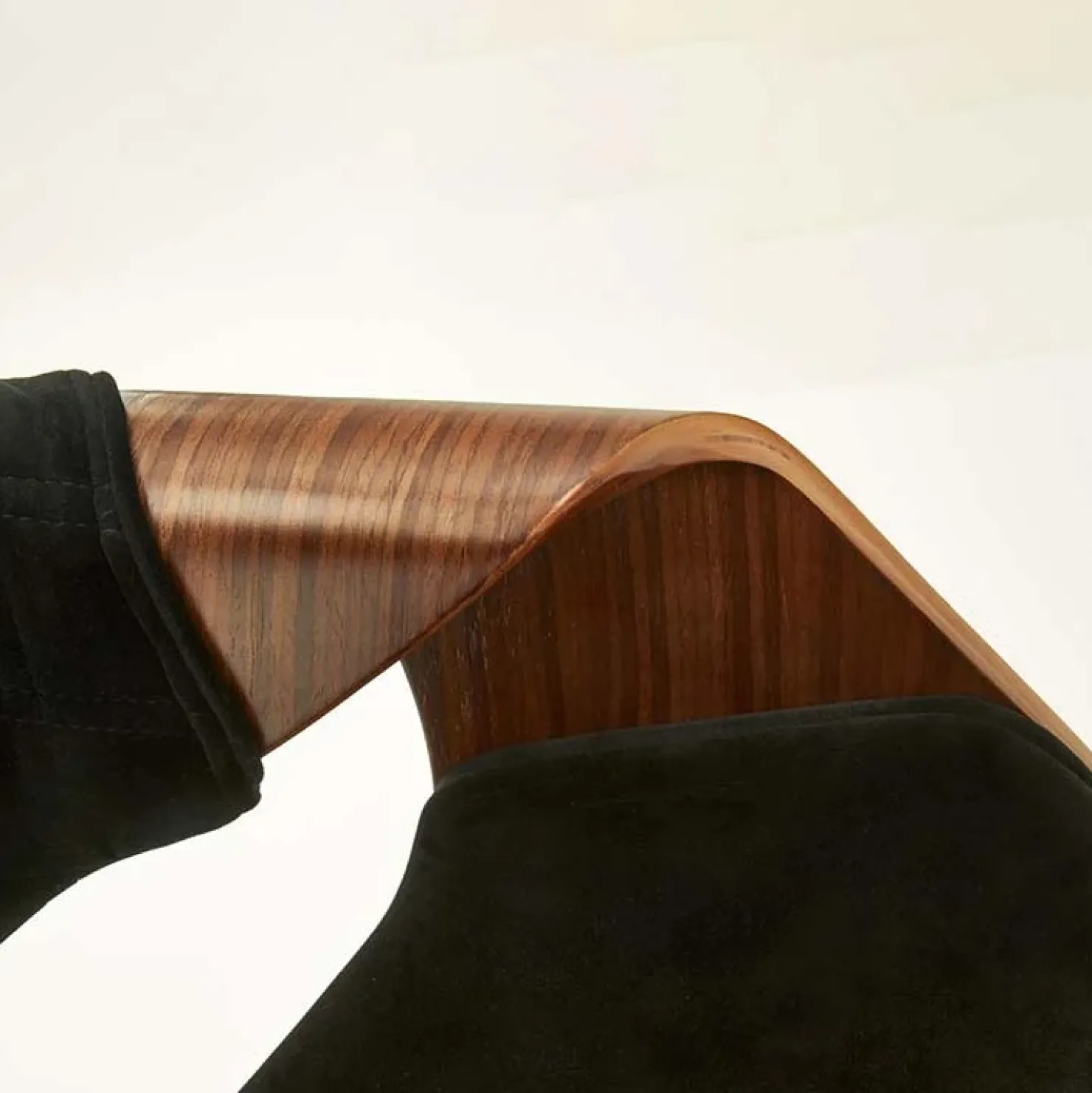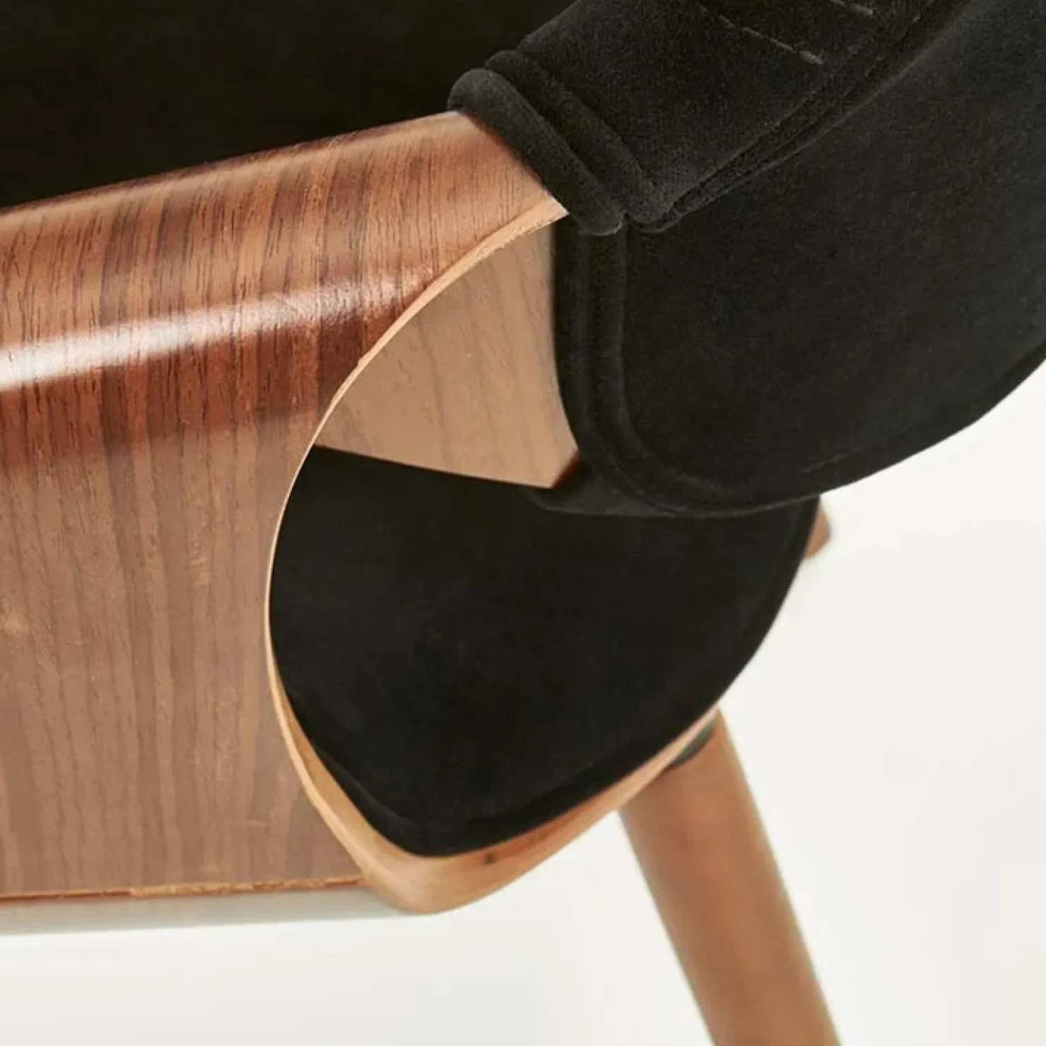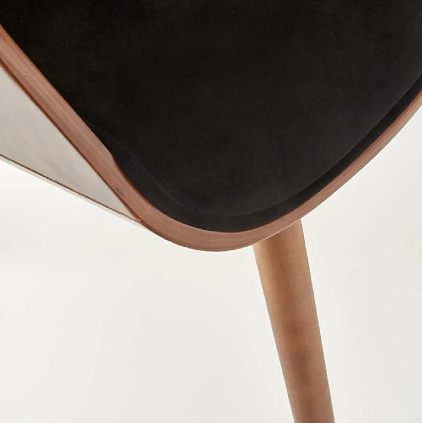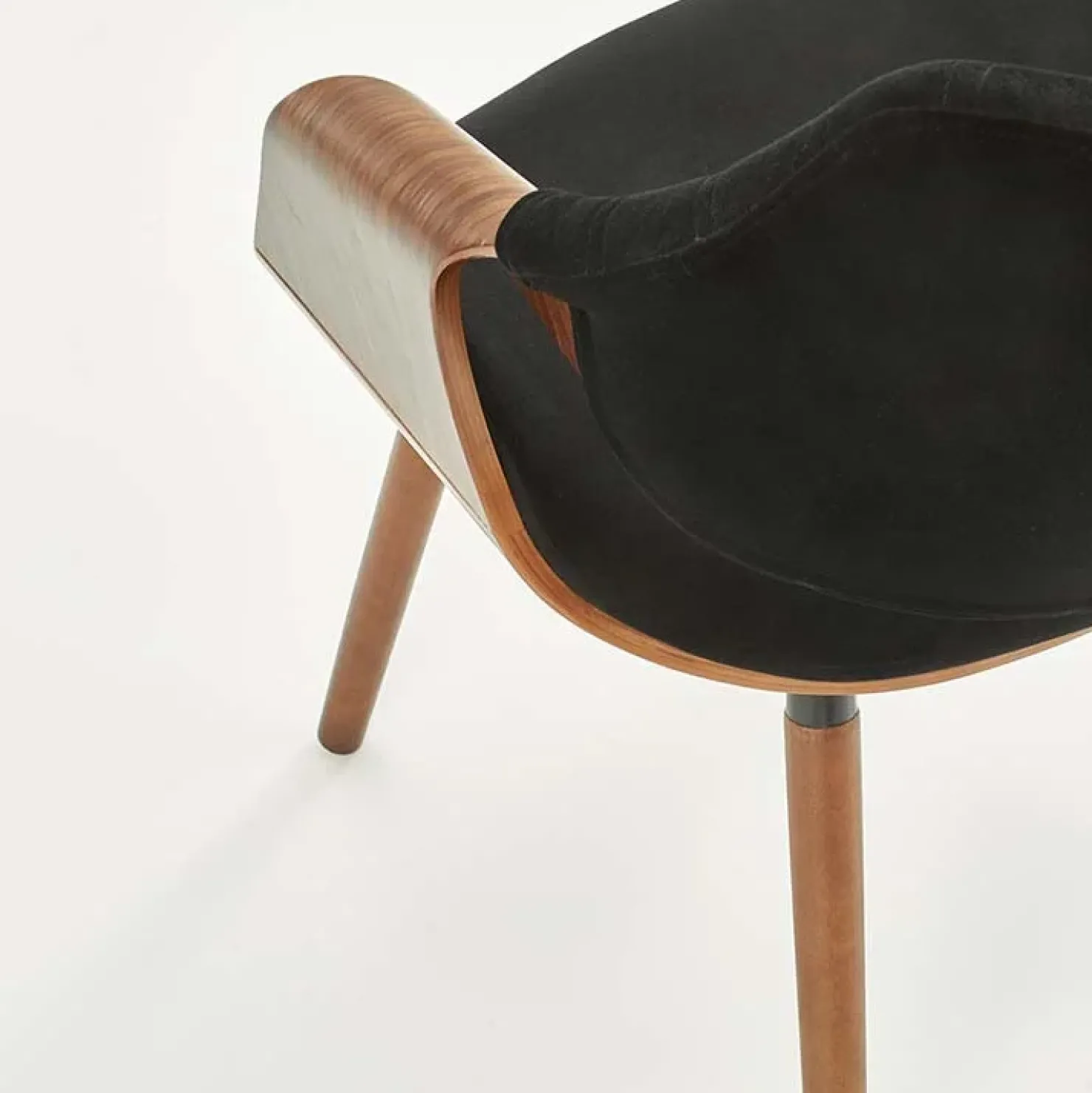 La struttura noce si accosta alla seduta in tessuto di velluto nero, creando un eccezionale effetto ottico.