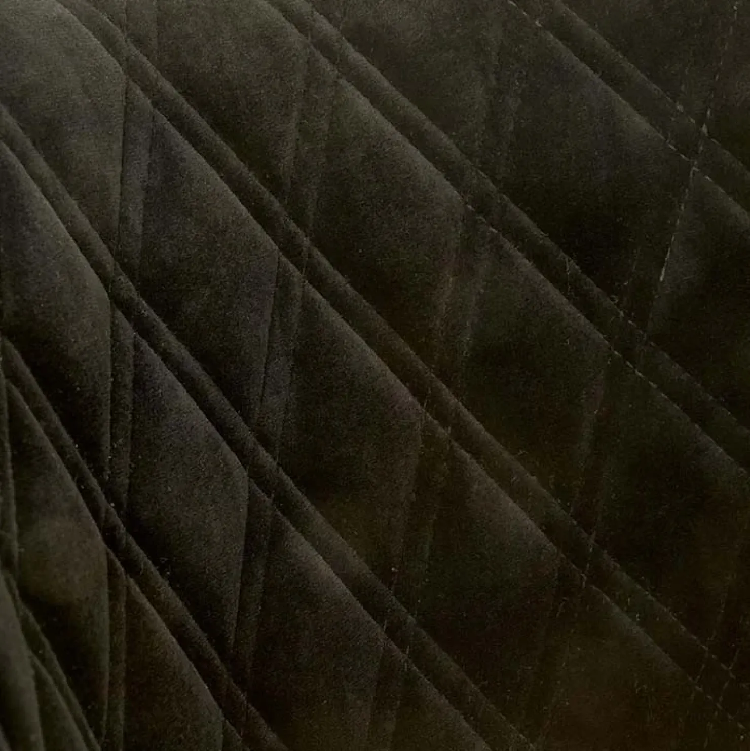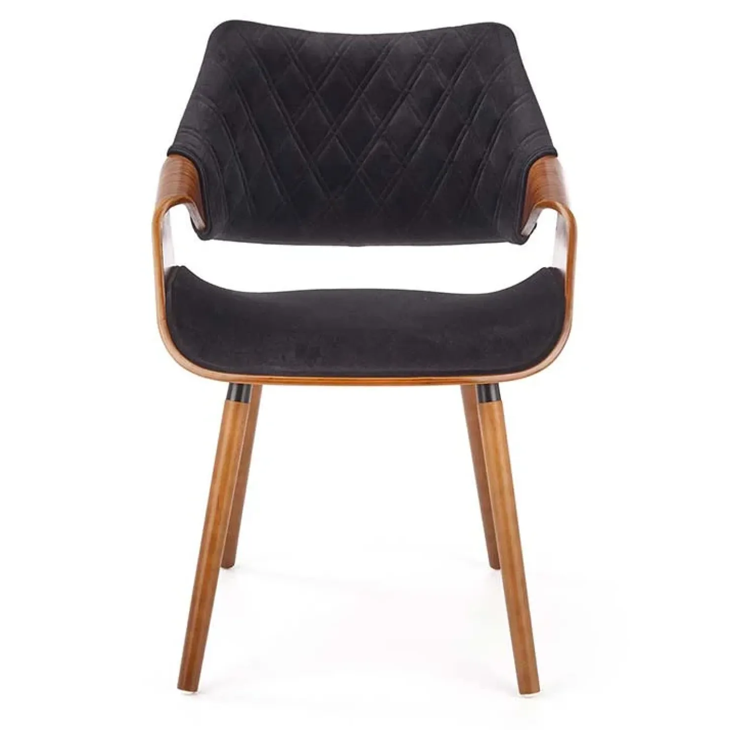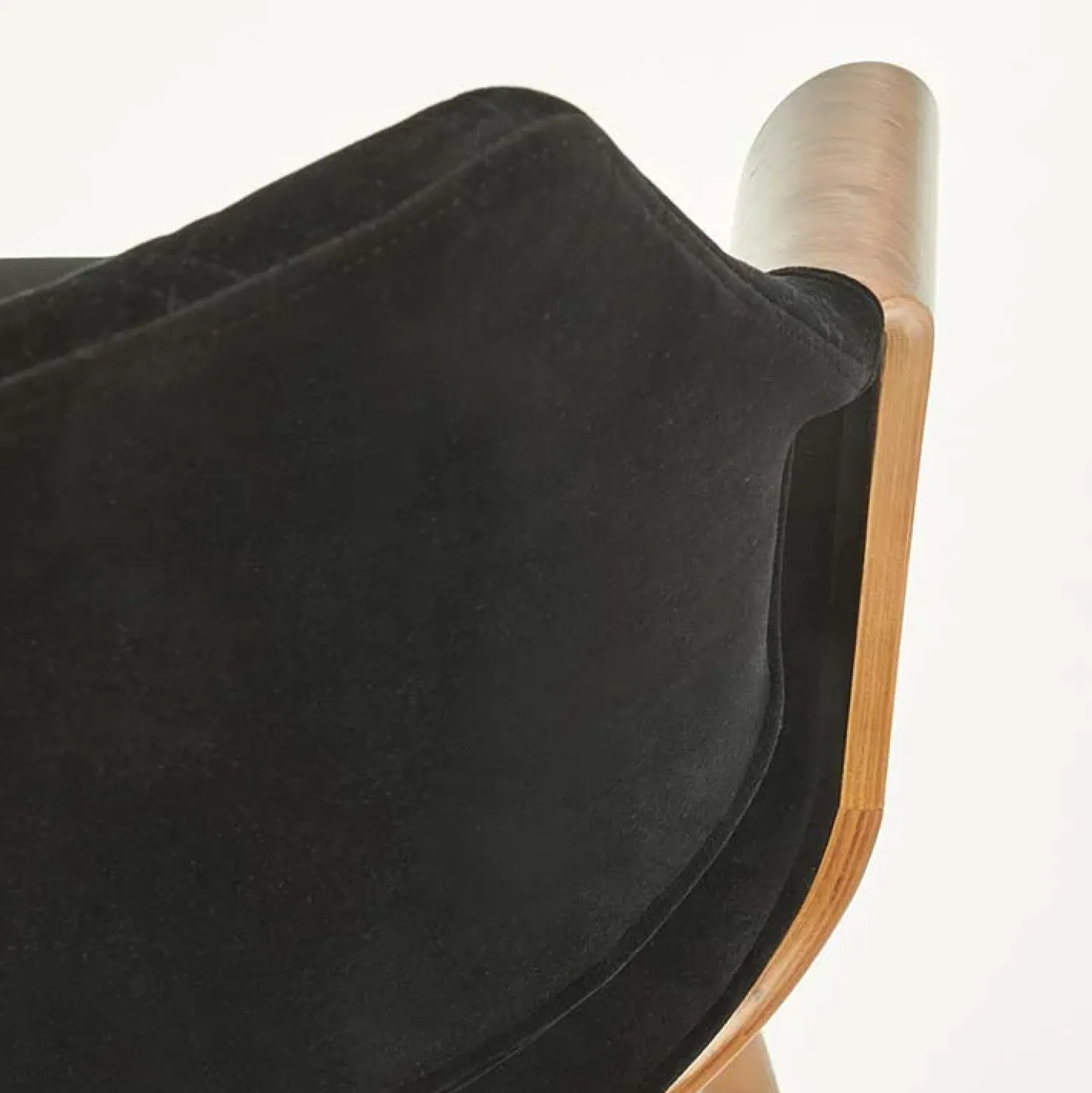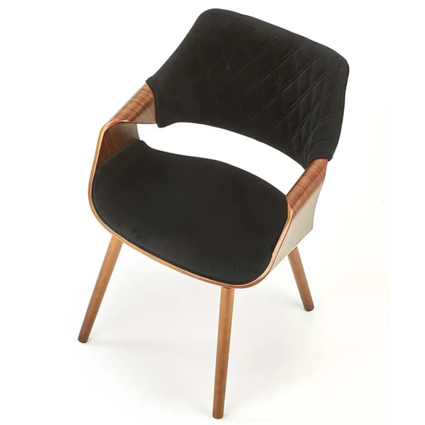 La struttura noce si accosta alla seduta in tessuto di velluto nero, creando un eccezionale effetto ottico.