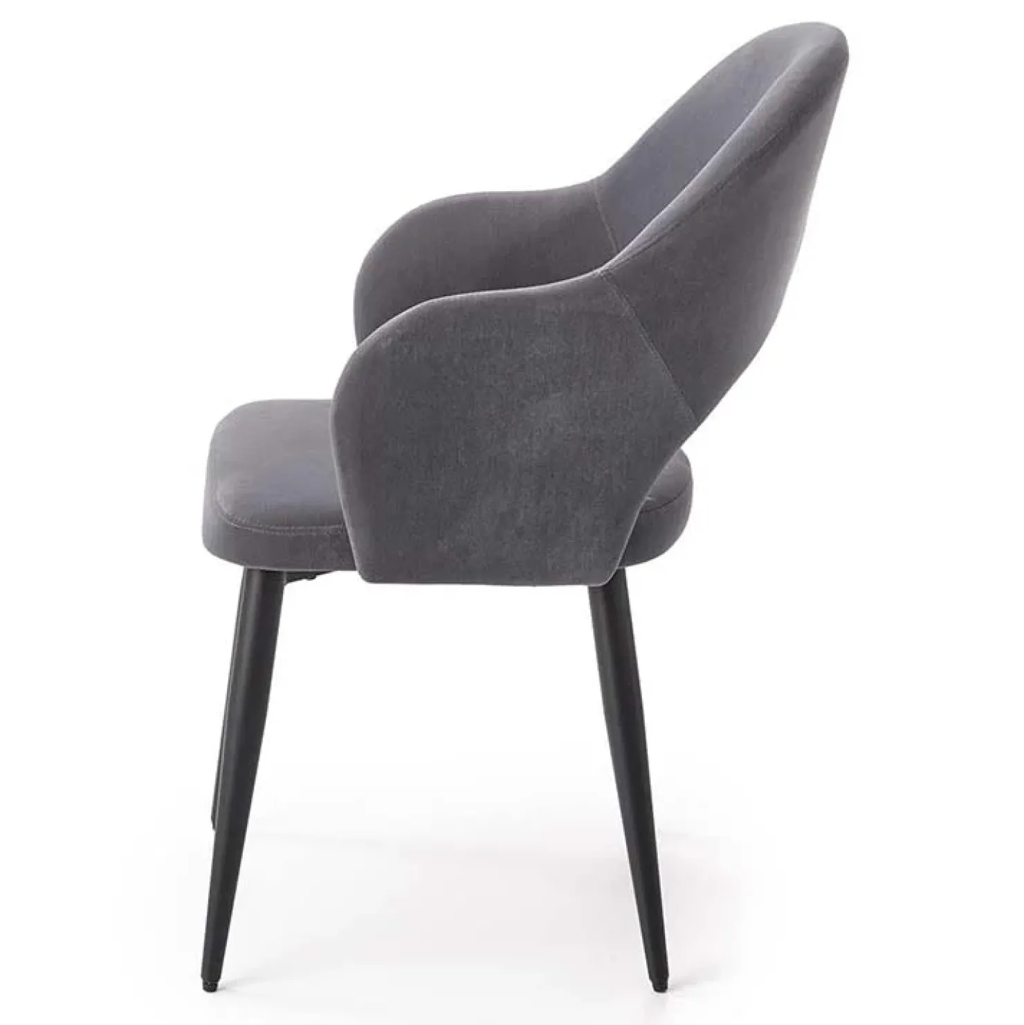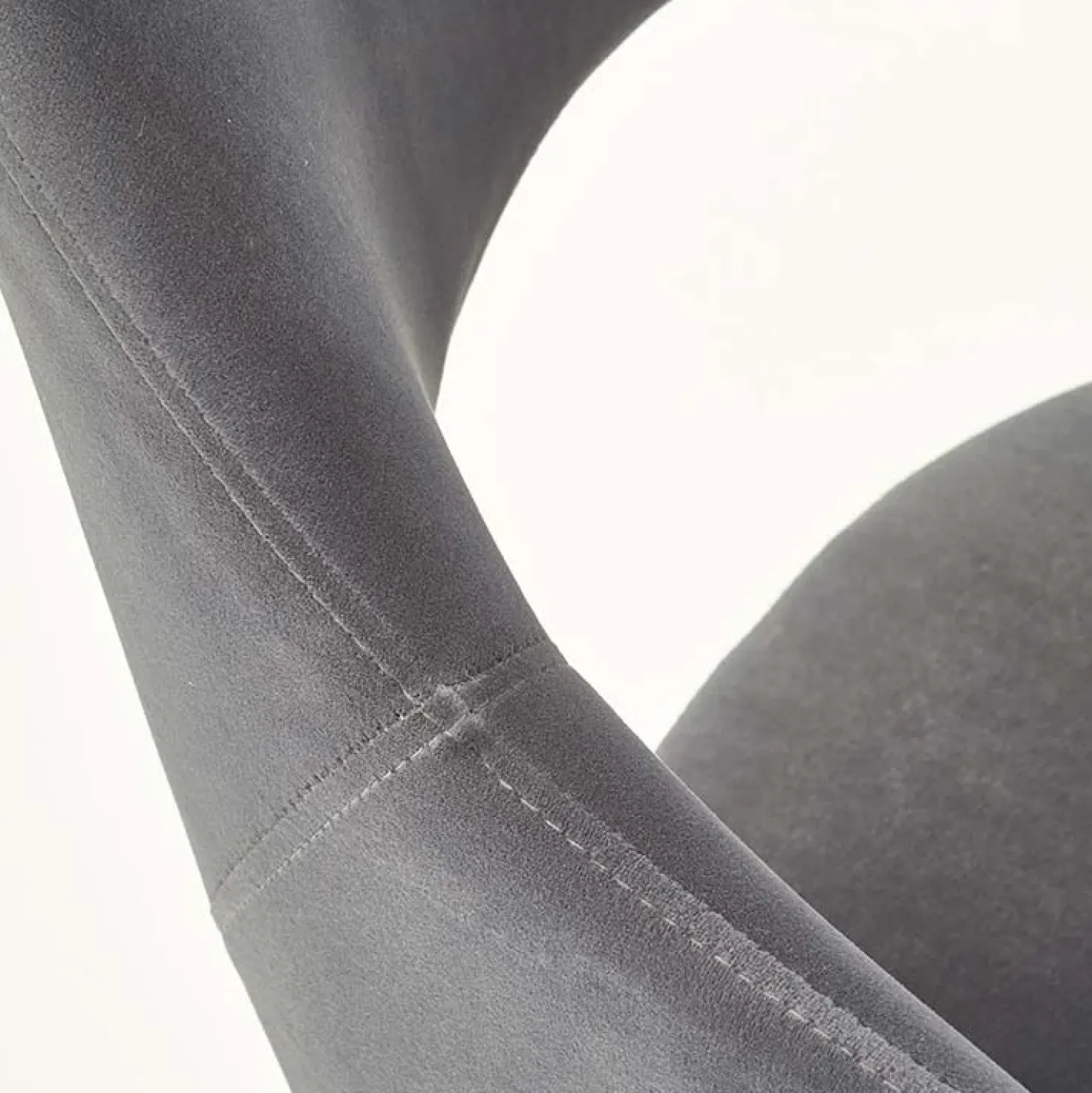 Alma è una sedia imbottita in velluto grigio, caratterizzata dal design innovativo ed elegante, perfetta per essere collocata in una sala da pranzo moderna o in uno studio arredato con cura.