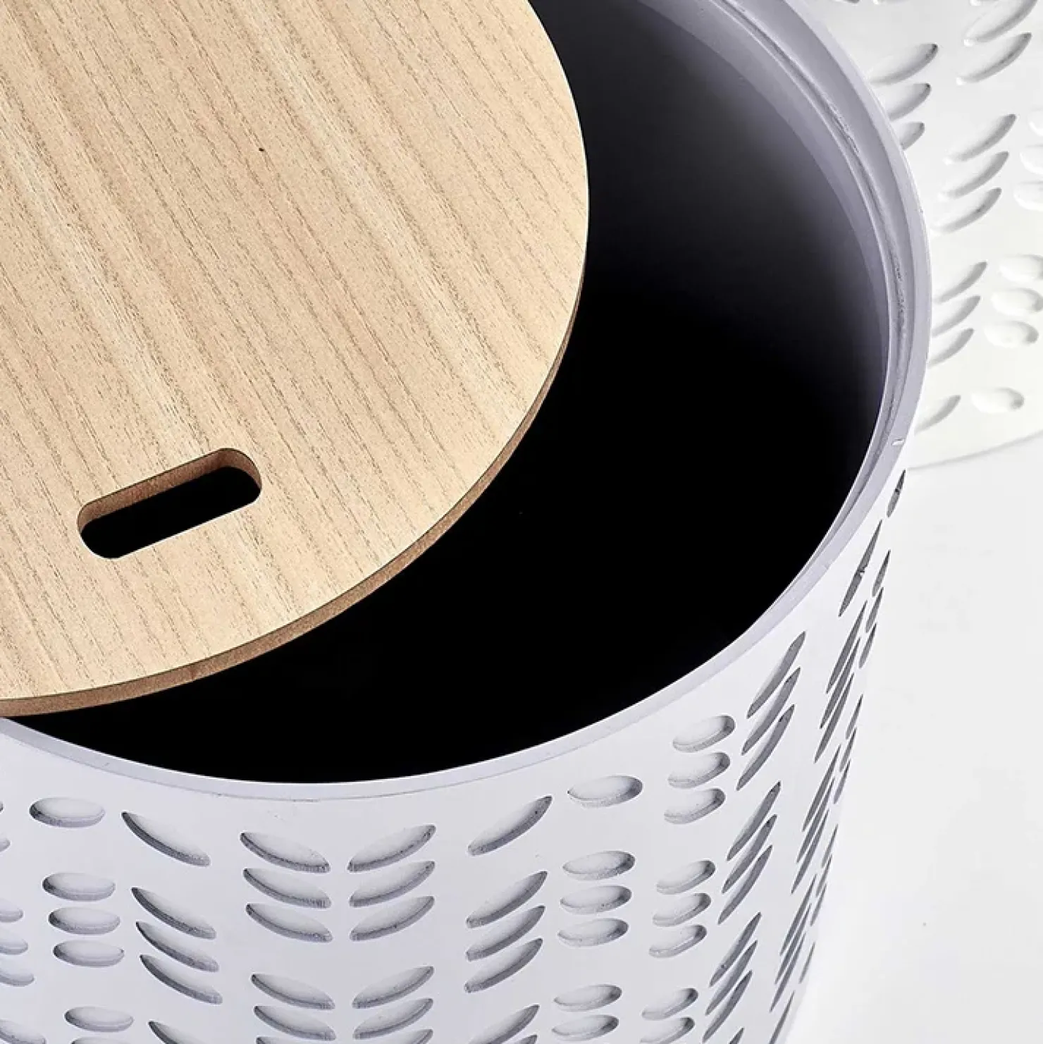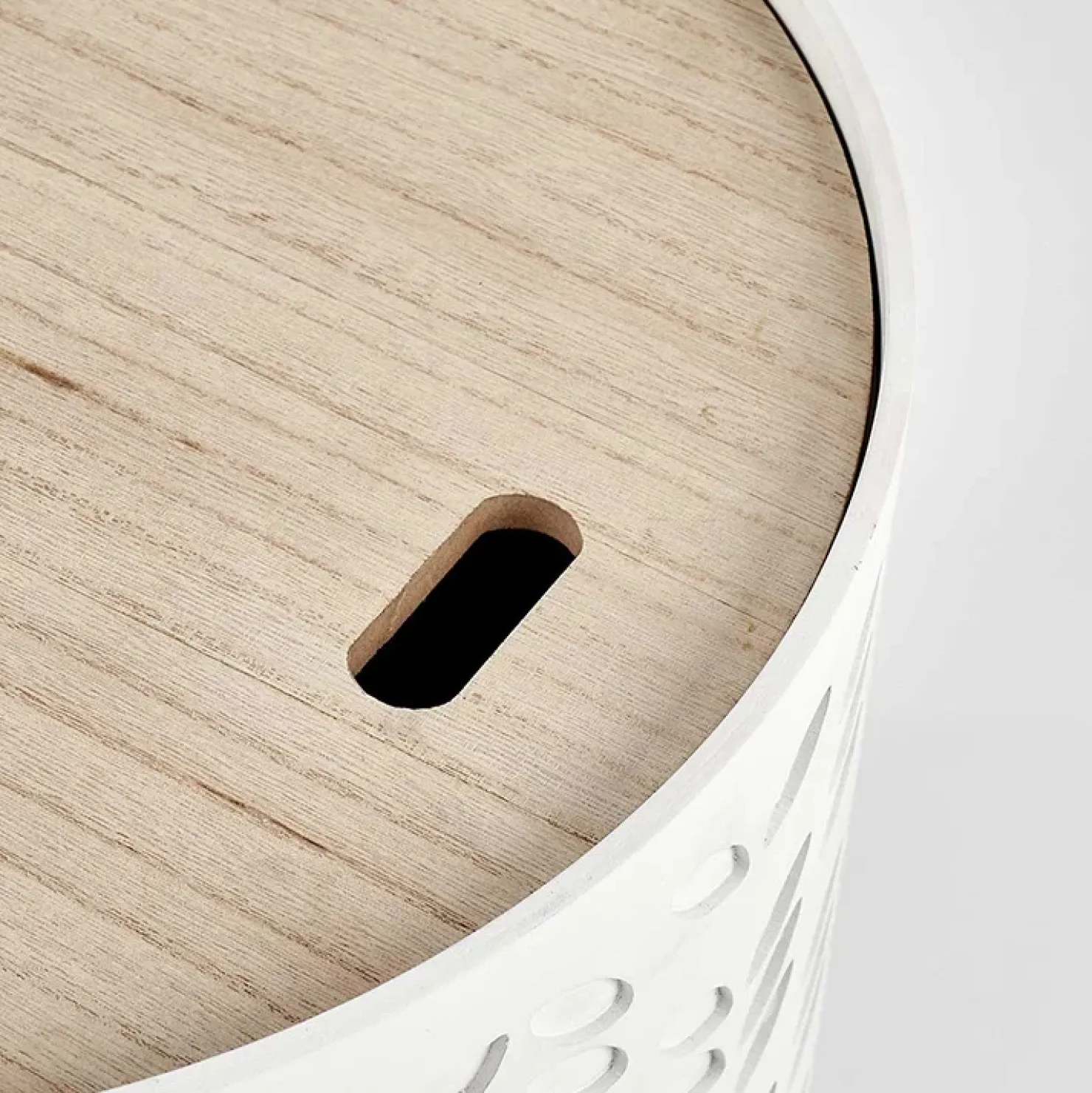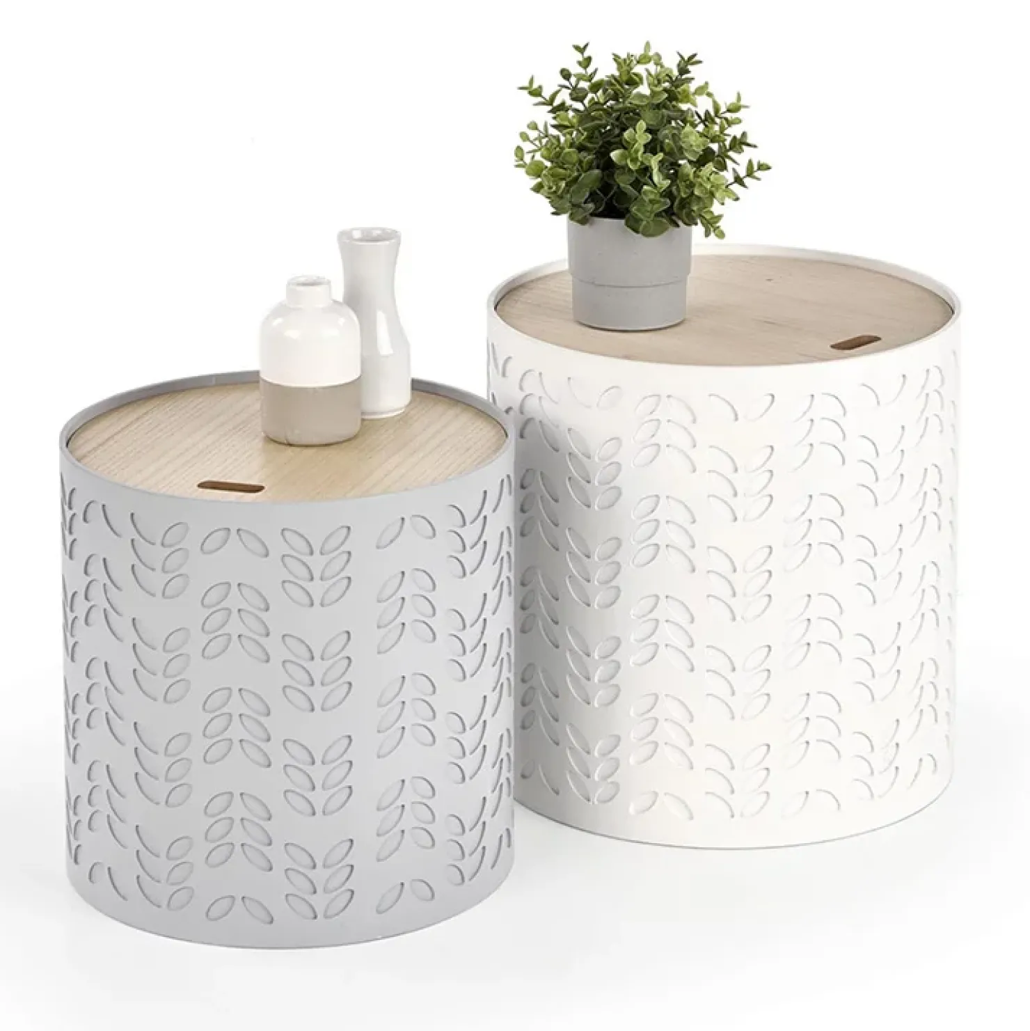Grazie ai piani circolari rimovibili in legno nella parte superiore, essi si trasformano in comodissimi cestini per contenere cuscini, riviste e telecomandi.