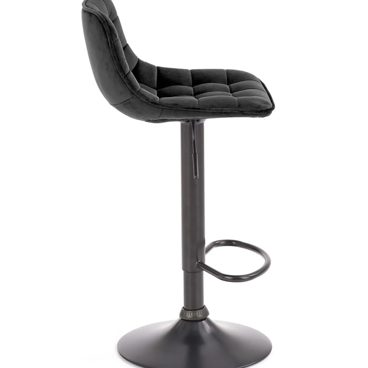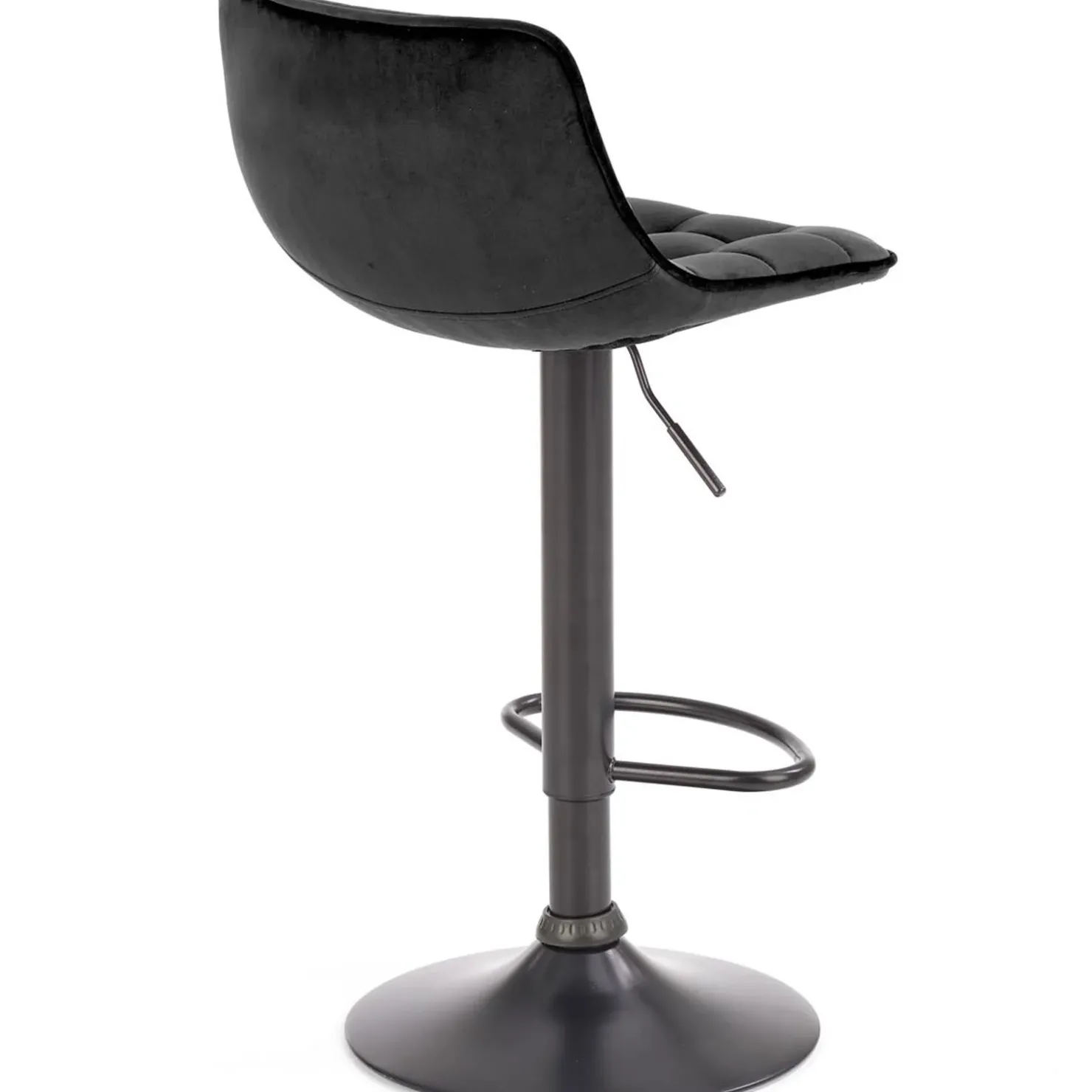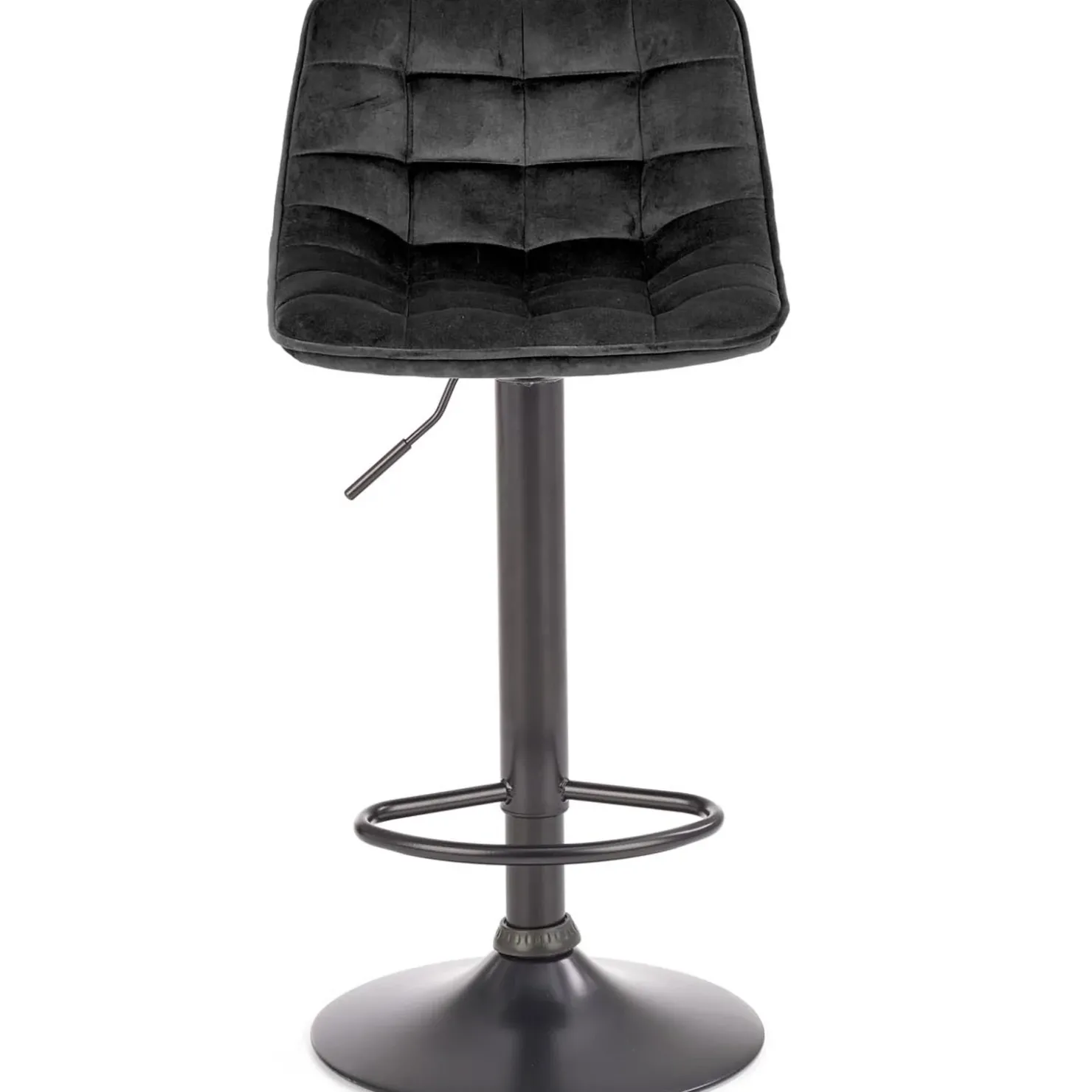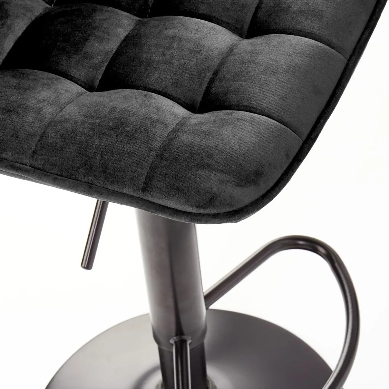 La seduta imbottita e trapuntata, rivestita in un pregiato velluto nero, dona un tocco caldo e sofisticato, rendendo lo sgabello non solo bello da vedere ma anche estremamente comodo. La struttura in acciaio nero, solida e resistente, è dotata di un pratico poggiapiedi integrato per un comfort maggiore.