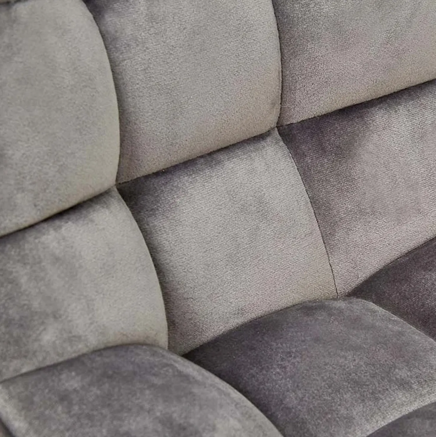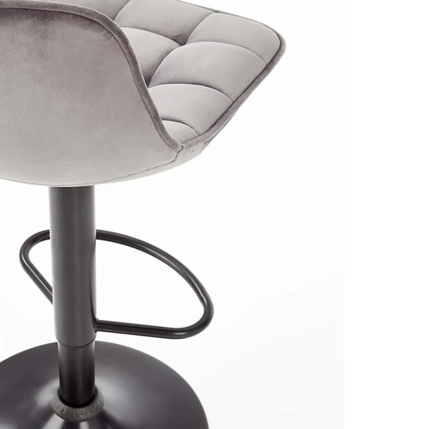 La seduta imbottita e trapuntata, rivestita in un pregiato velluto grigio, dona un tocco caldo e sofisticato, rendendo lo sgabello non solo bello da vedere ma anche estremamente comodo. La struttura in acciaio nero, solida e resistente, è dotata di un pratico poggiapiedi integrato per un comfort maggiore.