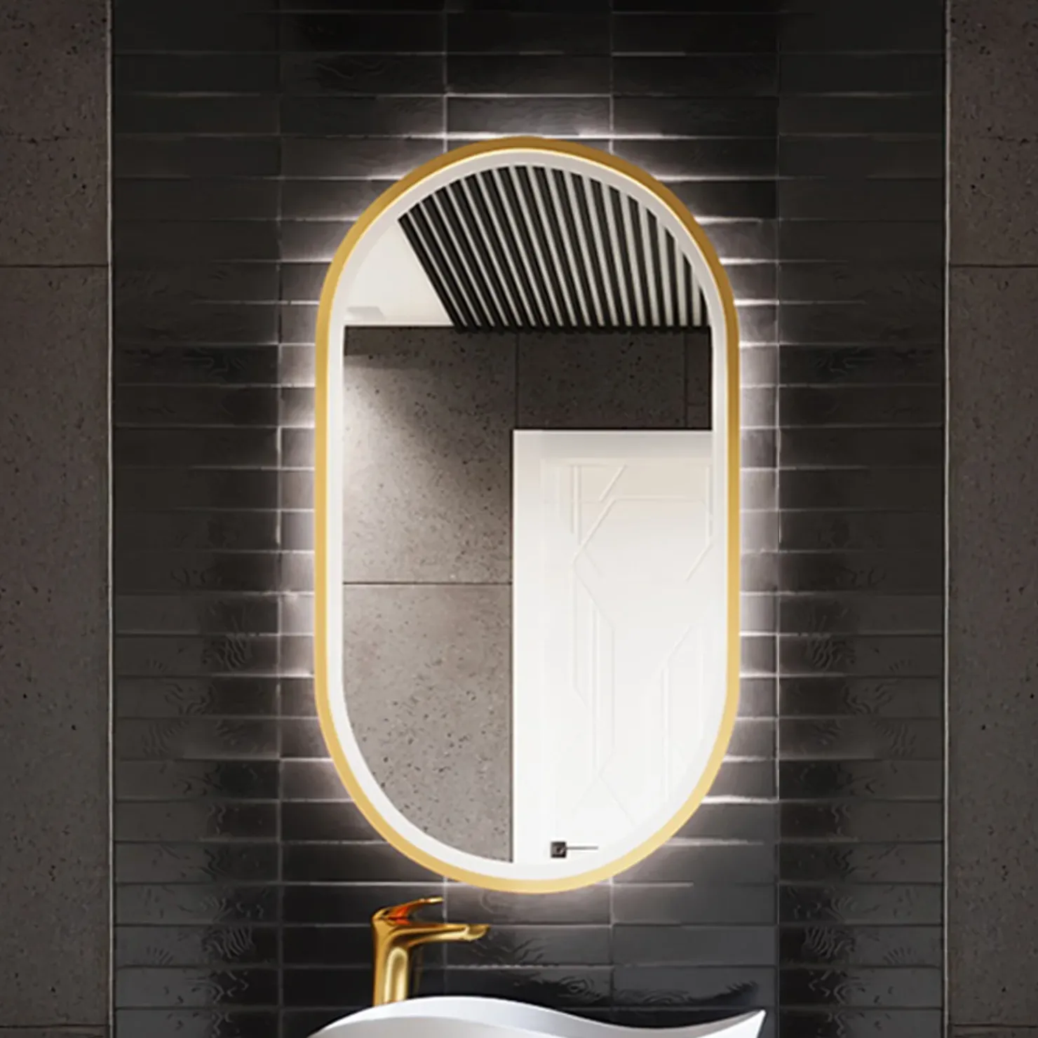 Lo specchio della collezione Glossy 2 è l’emblema di una bellezza sobria e moderna. Con la sua forma ovale allungata in verticale e la cornice sottile dorata, si inserisce con eleganza nell’ambiente bagno, slanciando visivamente lo spazio e aggiungendo un tocco di stile contemporaneo.