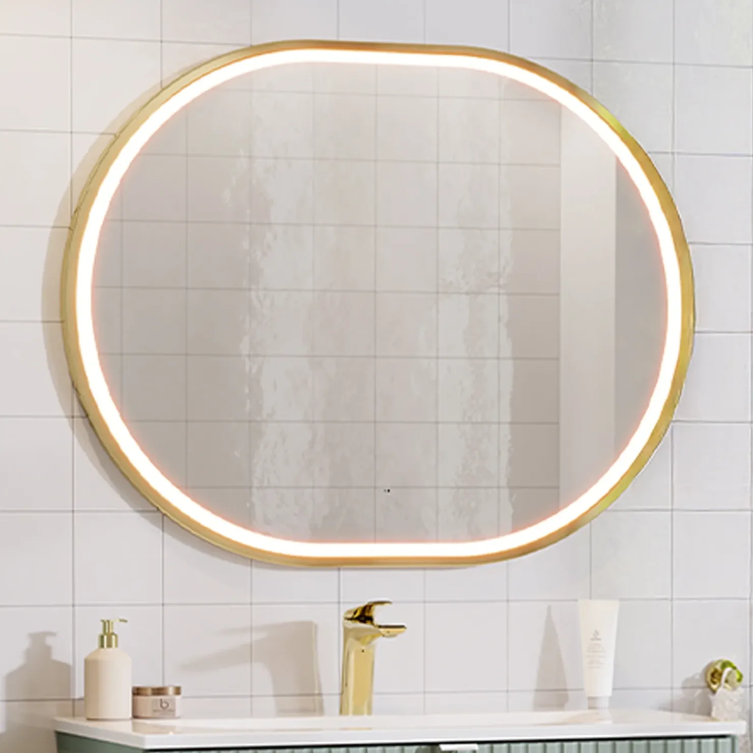 La cornice dorata dona un tocco di lusso contemporaneo, mentre la luce LED a basso consumo garantisce un’illuminazione uniforme, ideale per make-up e rasatura.