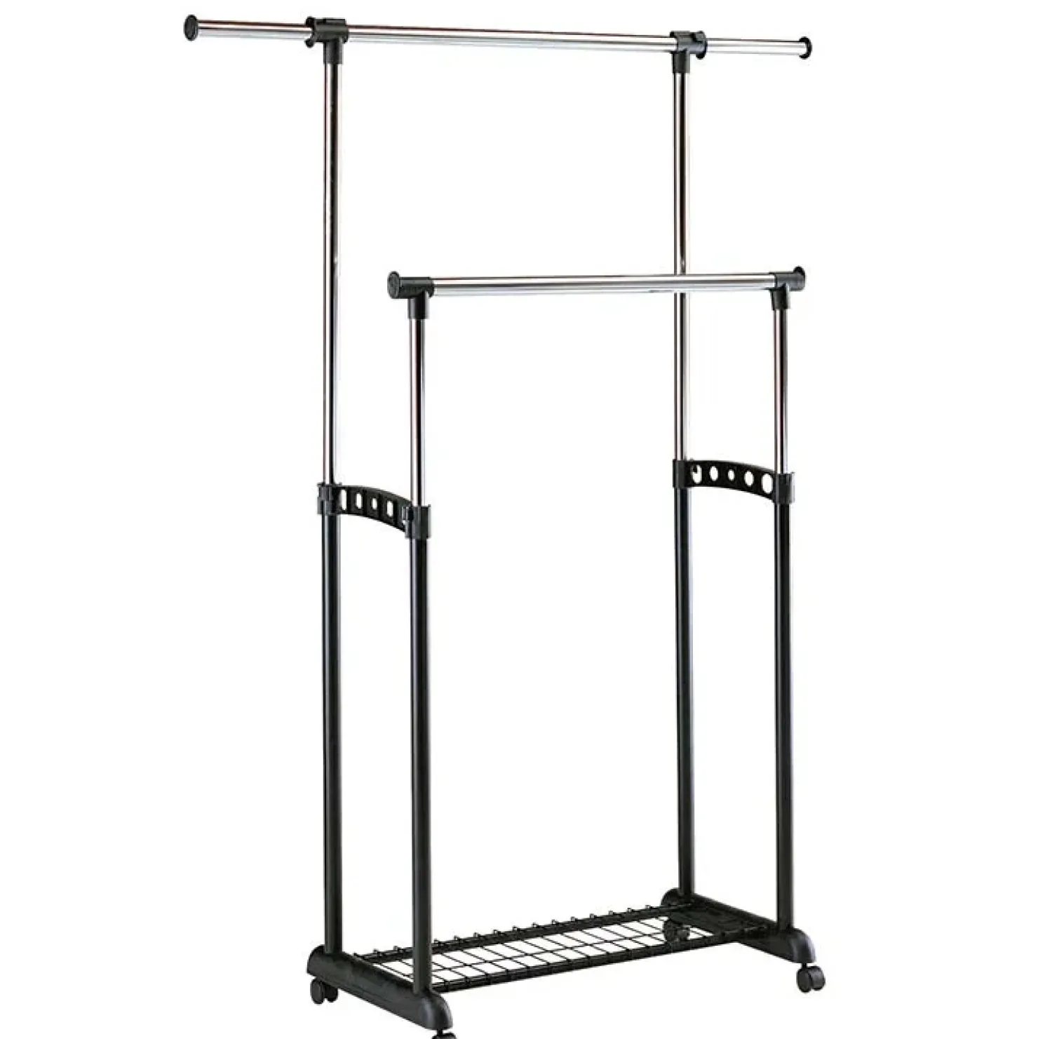 Stand appendiabiti regolabile allungabile con ruote Bonney in acciaio cromato plastica nero: la soluzione perfetta per mantenere in ordine gli indumenti e gli oggetti da tenere a portata di mano.