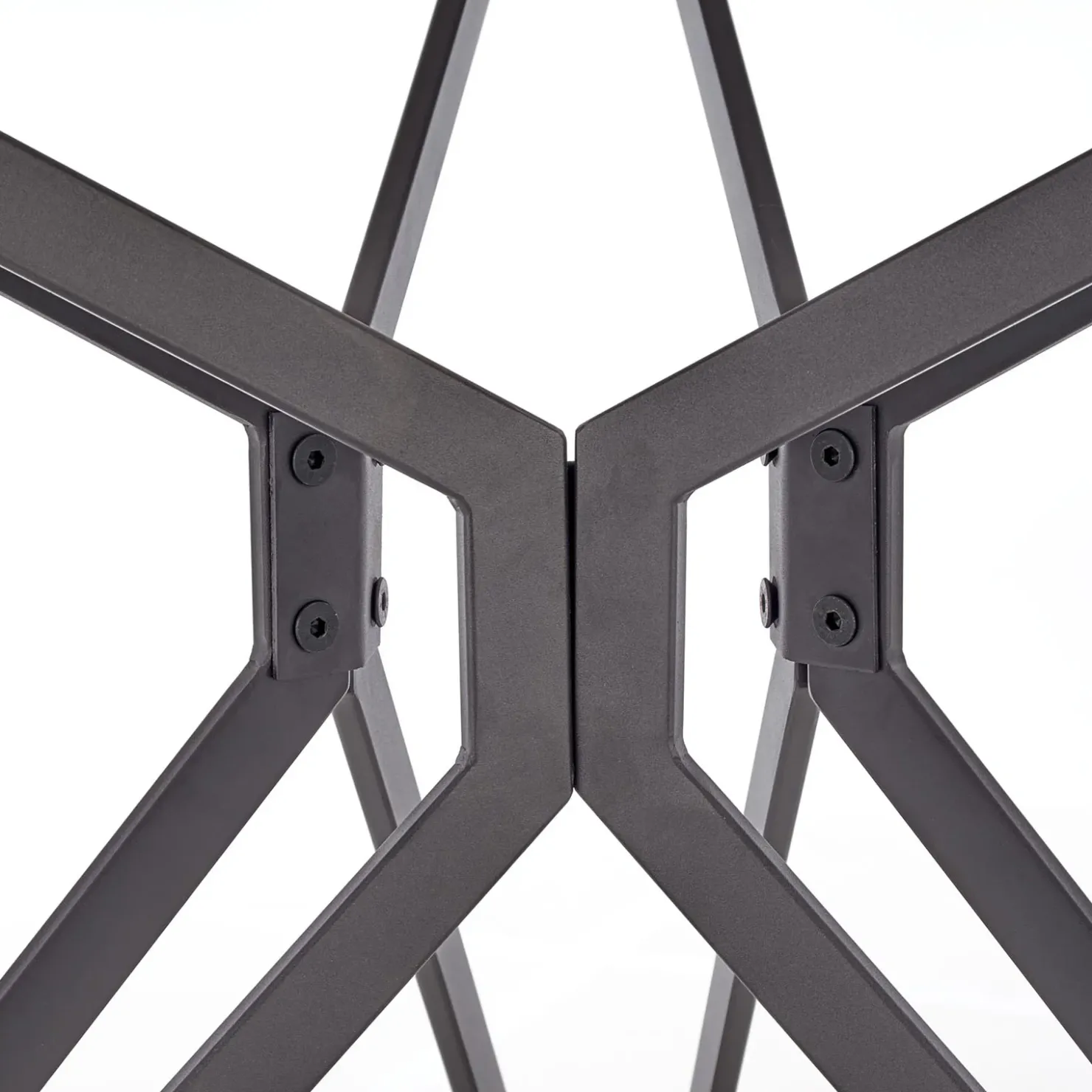 A sostegno, una struttura in acciaio nero verniciato a polvere, caratterizzata da un gioco di linee incrociate che conferisce leggerezza visiva e grande stabilità. Il contrasto tra la superficie chiara e le gambe scure crea un effetto moderno e sofisticato, perfetto per ambienti contemporanei, nordici o industrial.