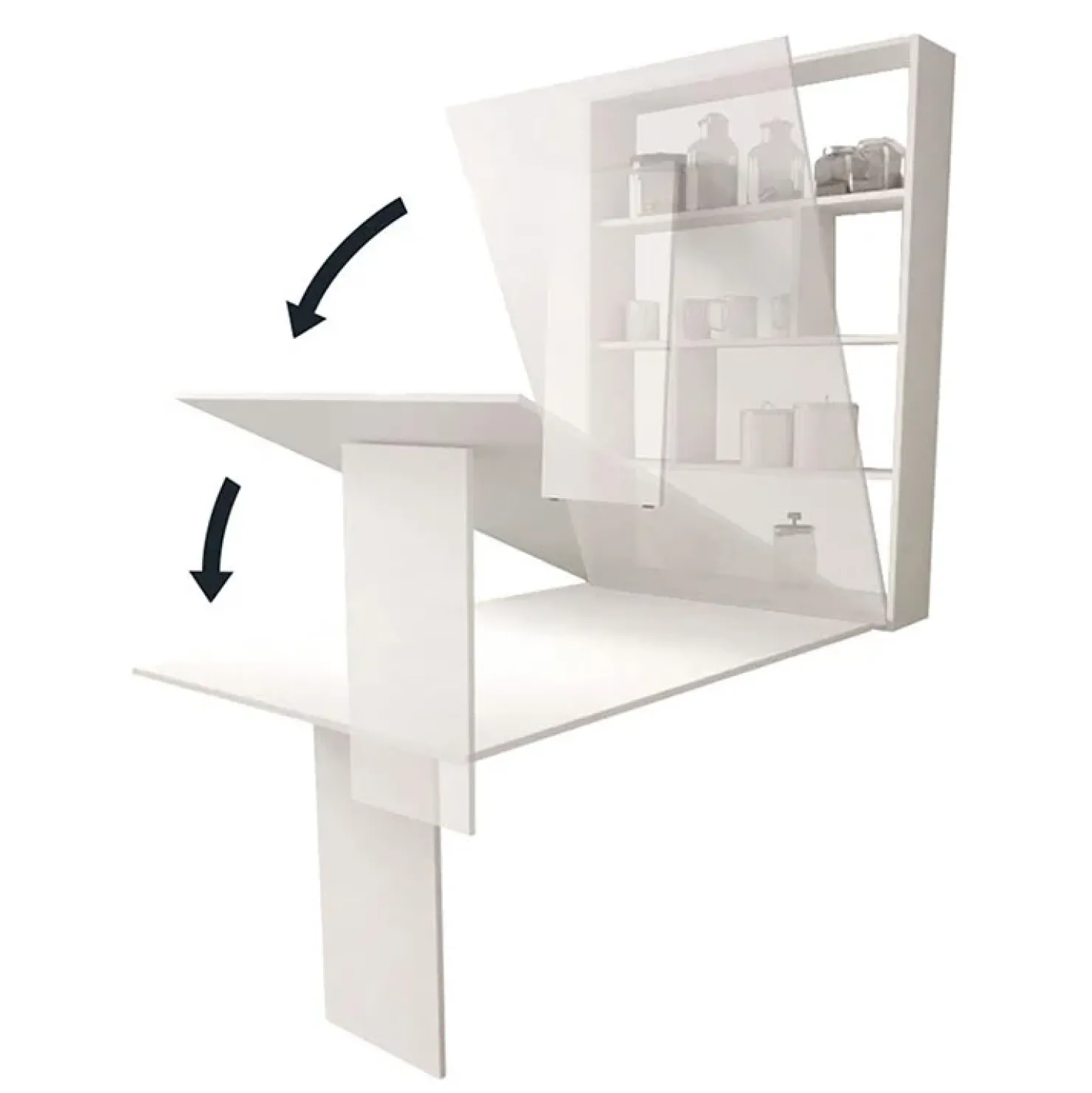 Quando è chiuso sembra un pensile ma quando è aperto mette in mostra alcune mensole da decorare come più ti piace.