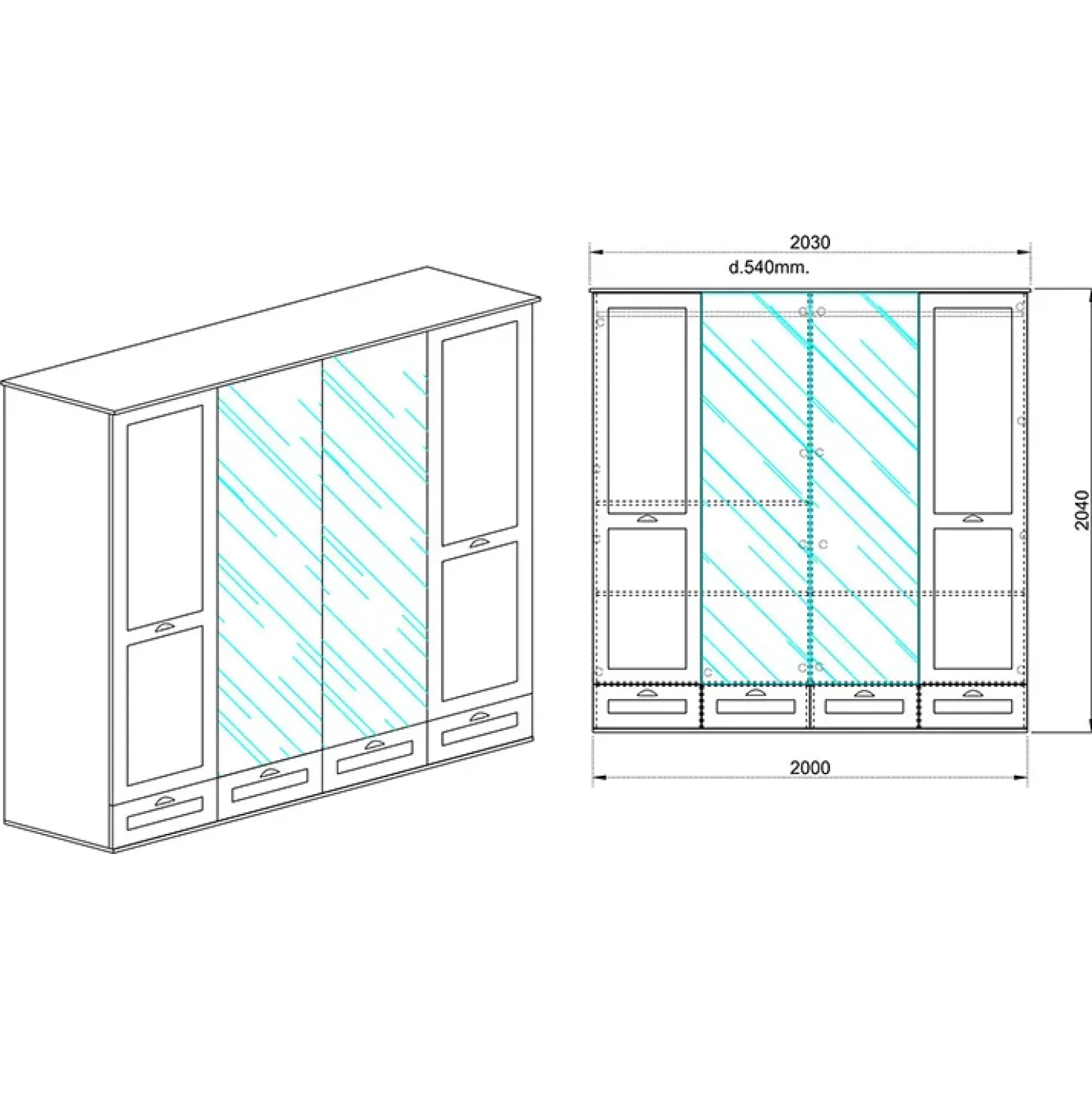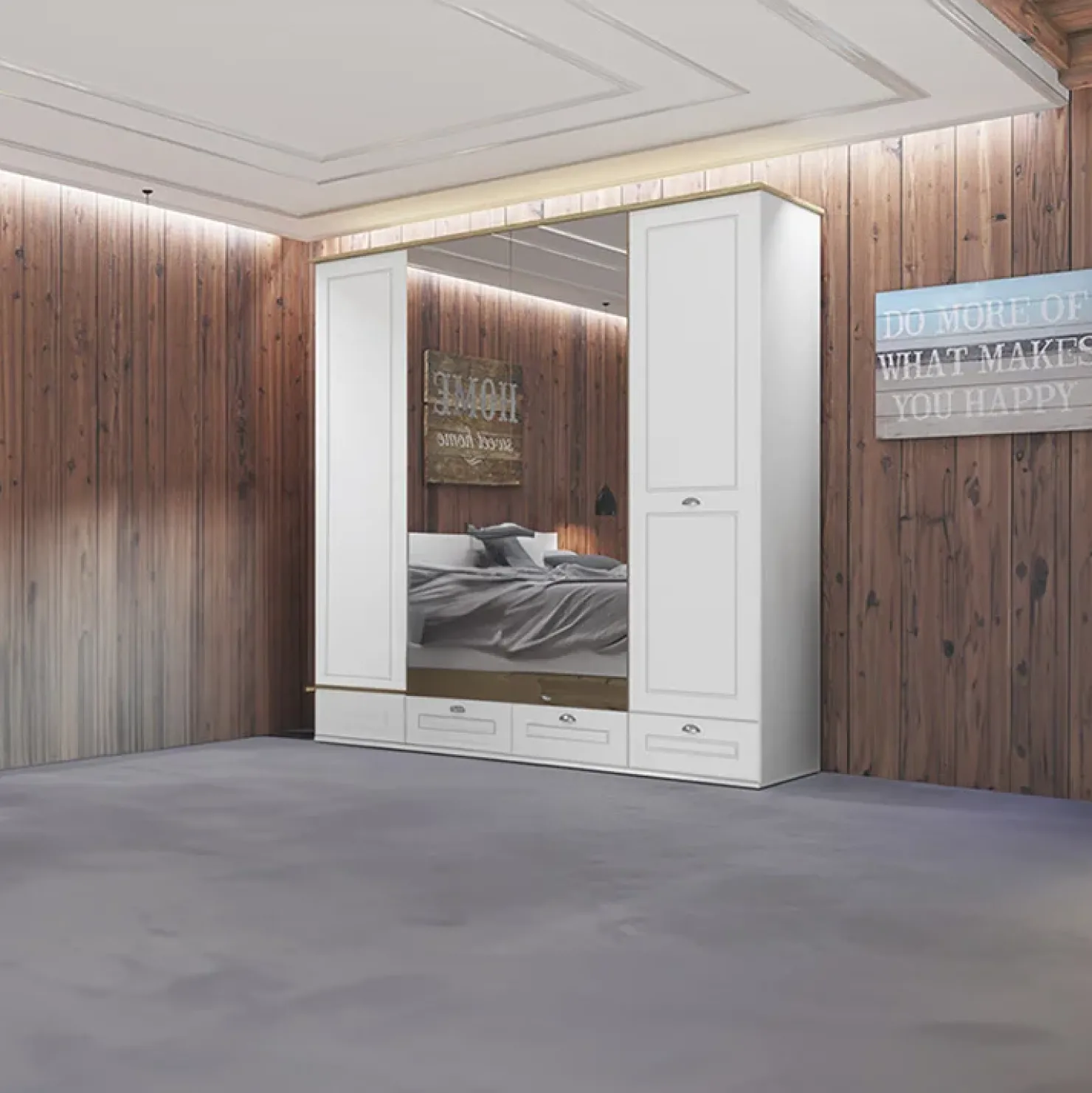 Armadio 203x205cm 4 cassetti 4 ante specchi bianco opaco Loira